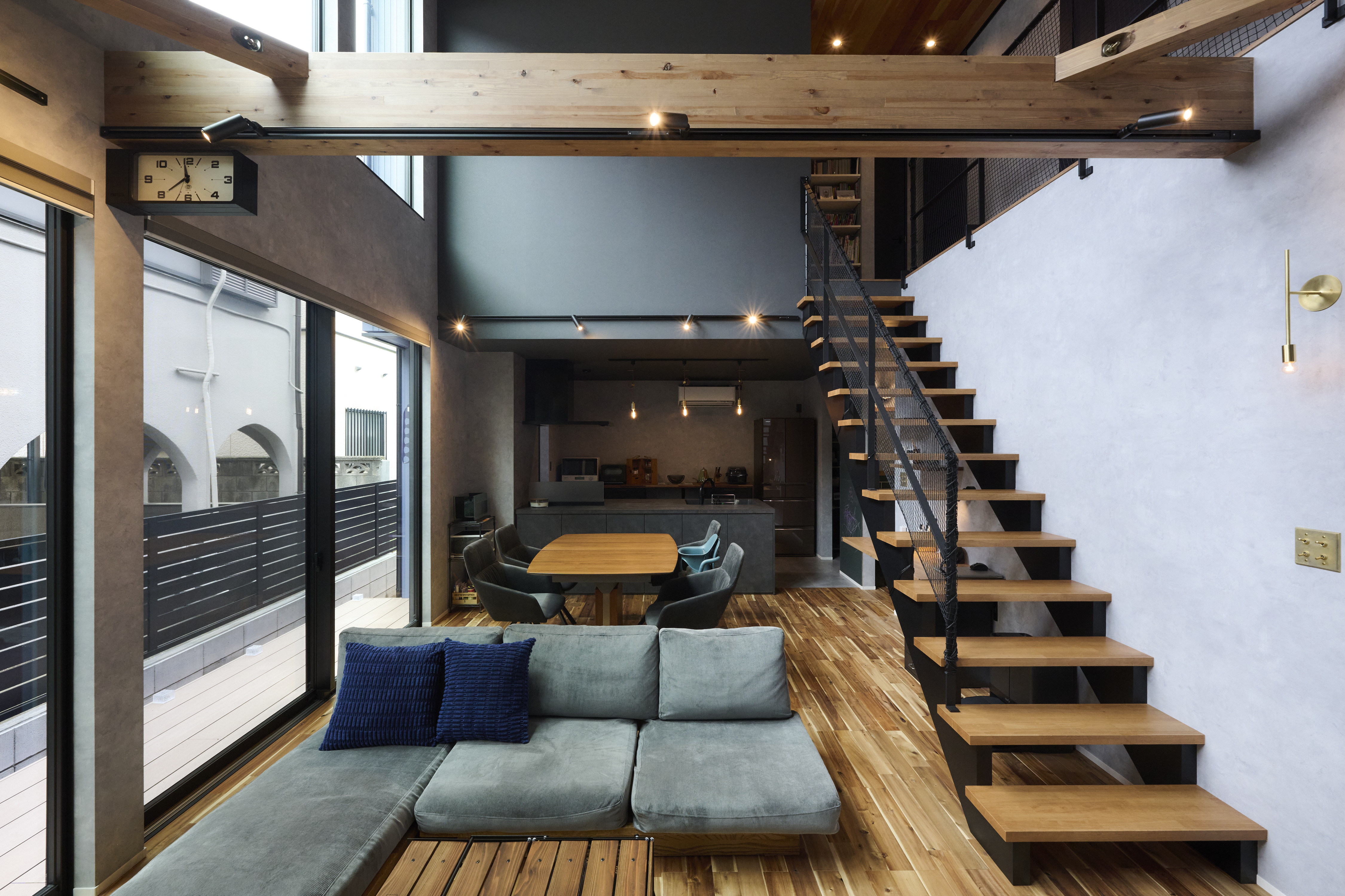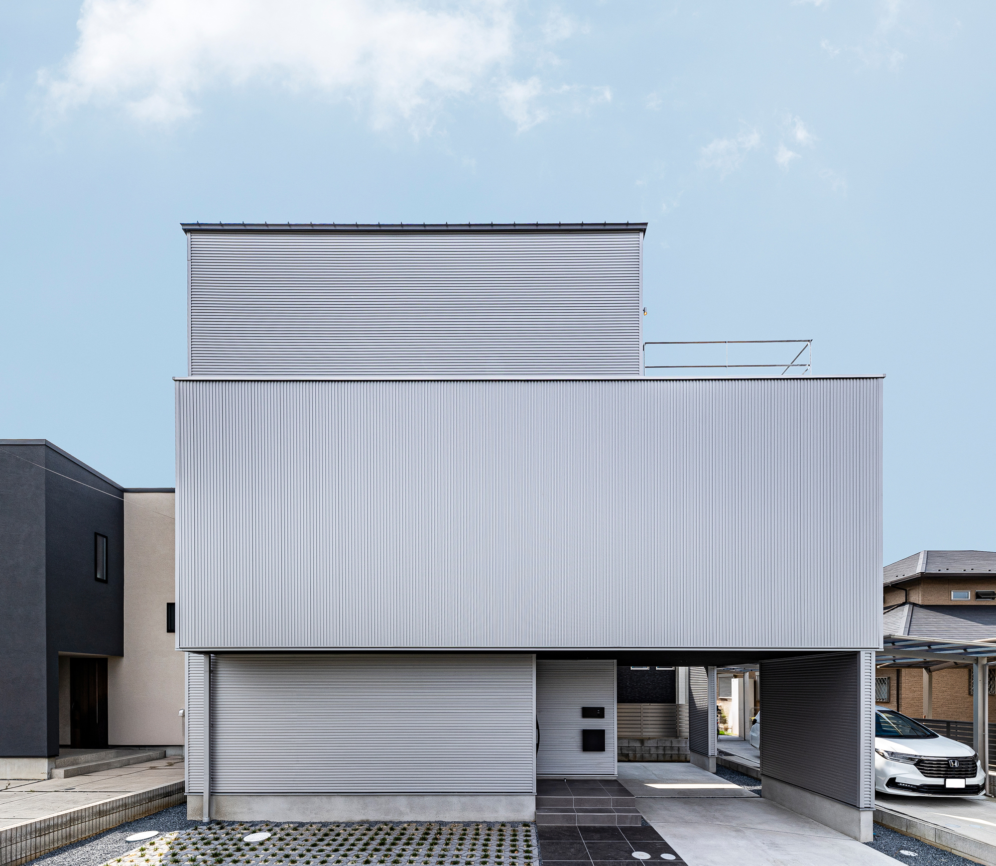 そこで提案するのが、正面に窓を設けないという逆転の発想です。光を「横から採る」のではなく「上から・内から巡らせる」設計により、外部の視線を遮断しながらも明るく開放的な空間を実現。都市型住宅の新しいスタンダードとなる一棟が完成しました。