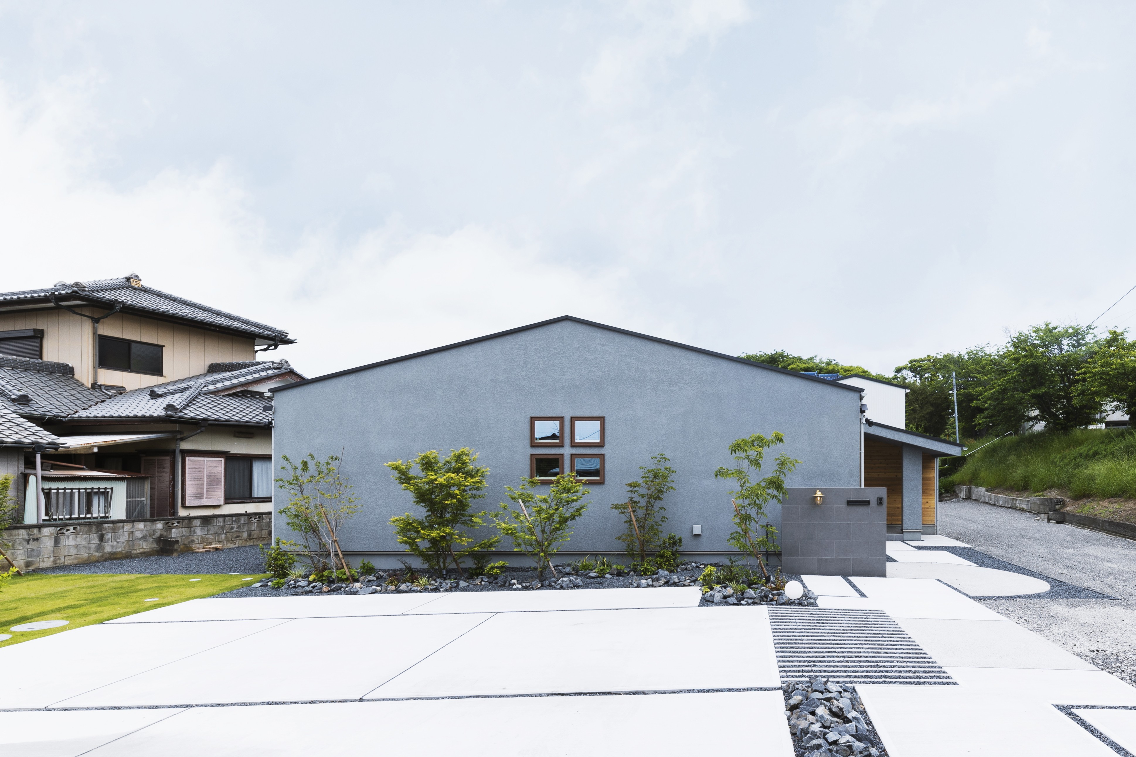 今回建築したのは、正面に窓を設けないプライバシーを十分に確保した住宅。正面から見ると「窓がない家」のように見える住まい。正面以外の多方向から光を取り込み、照明計画により明るさを担保し開放的な住まいを実現することができました。