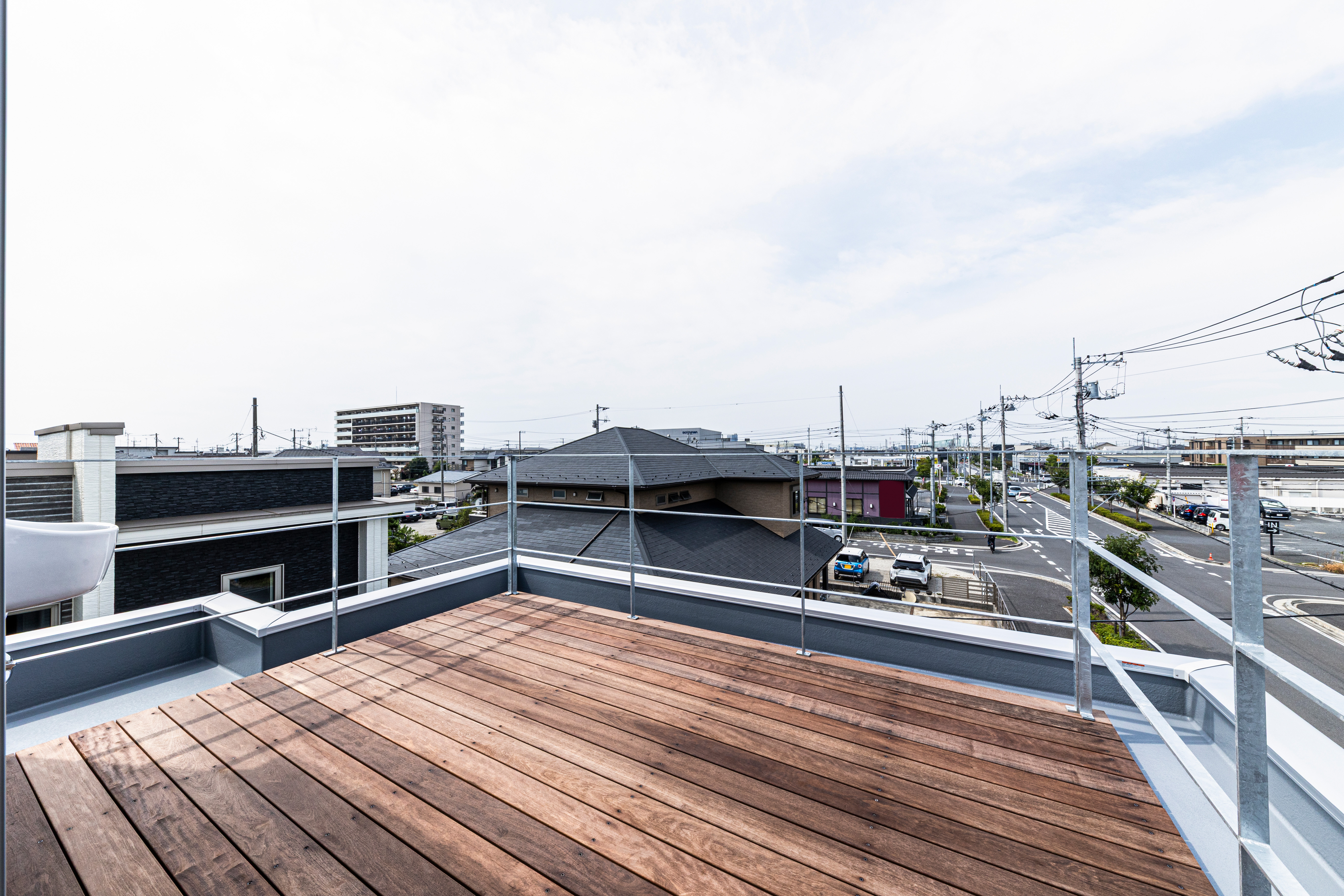 3階に設置されたウッドデッキ。前を遮るものがなく見晴らしが良いのが魅力です。