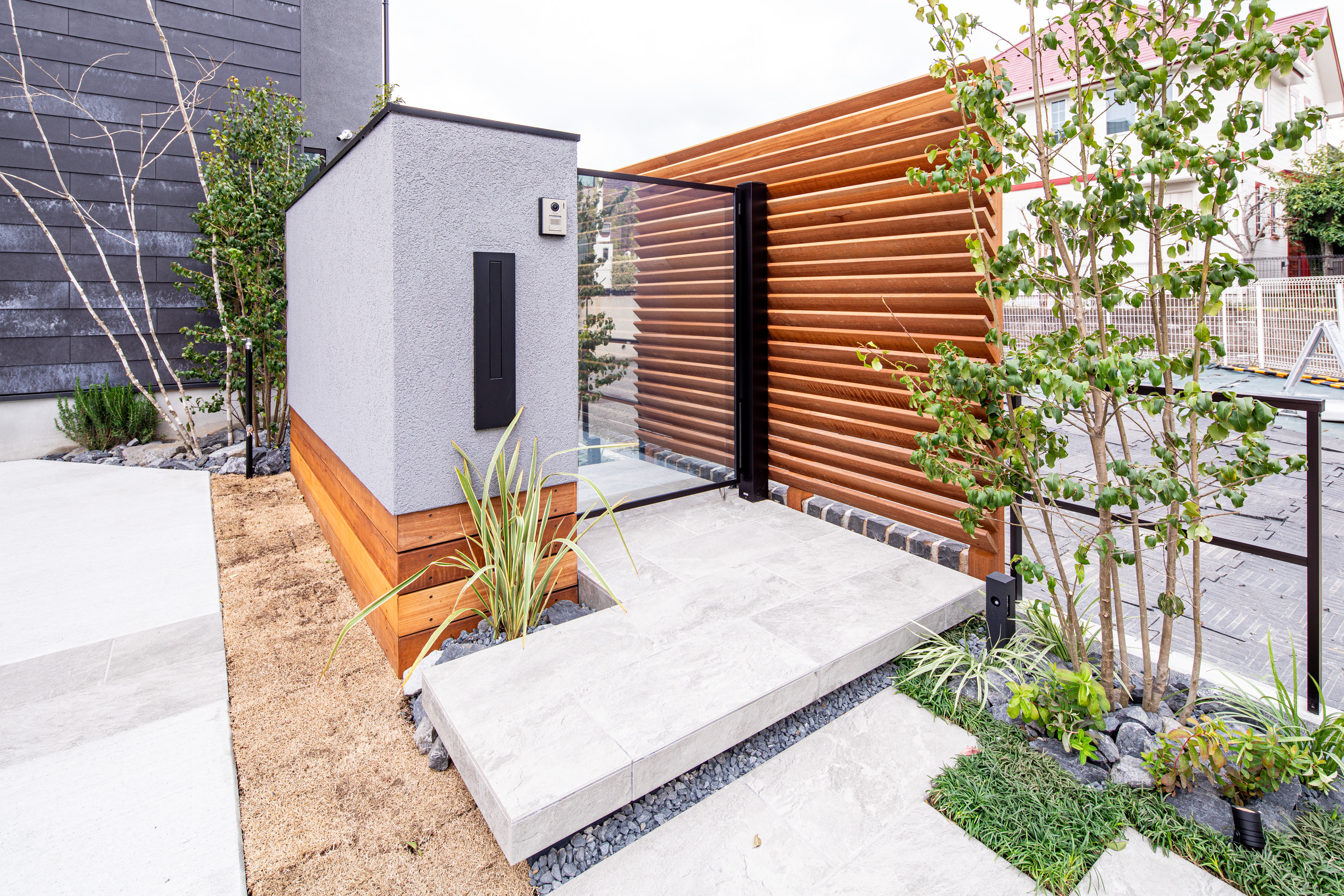 無機質な外観や門扉のガラス・駐車スペースの中に自然の温かみを感じられるよう、植栽をあえて斜めに配置し、天然木をあしらったウッドフェンスや門袖で柔らかさを加えました。素材の対比と調和を意識しながら、街並みに馴染みつつも印象に残る佇まいを目指しています。