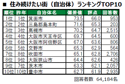 5年連続で、豊能郡豊能町が1位に輝きました。2位は泉南郡田尻町(せんなんぐん たじりちょう)で、昨年3位から順位を上げました。3位も、昨年4位から順位を上げた三島郡島本町です。トップ3は、全て郡部に属する「町」という結果になっています。