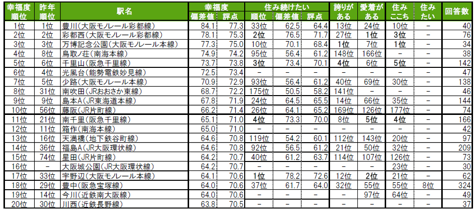 1位は3年連続で豊川で、唯一偏差値80台の極めて高い評価を得ています。2位は、2年連続で彩都西です。トップ2は、茨木市に位置する大阪モノレール彩都線沿線の駅となっています。3位は、2年連続で吹田市に位置する万博記念公園です。その他トップ10内では、8位南吹田(昨年31位)、10位藤阪(昨年56位)が、昨年から大きく順位を上げてトップ10入りしています。