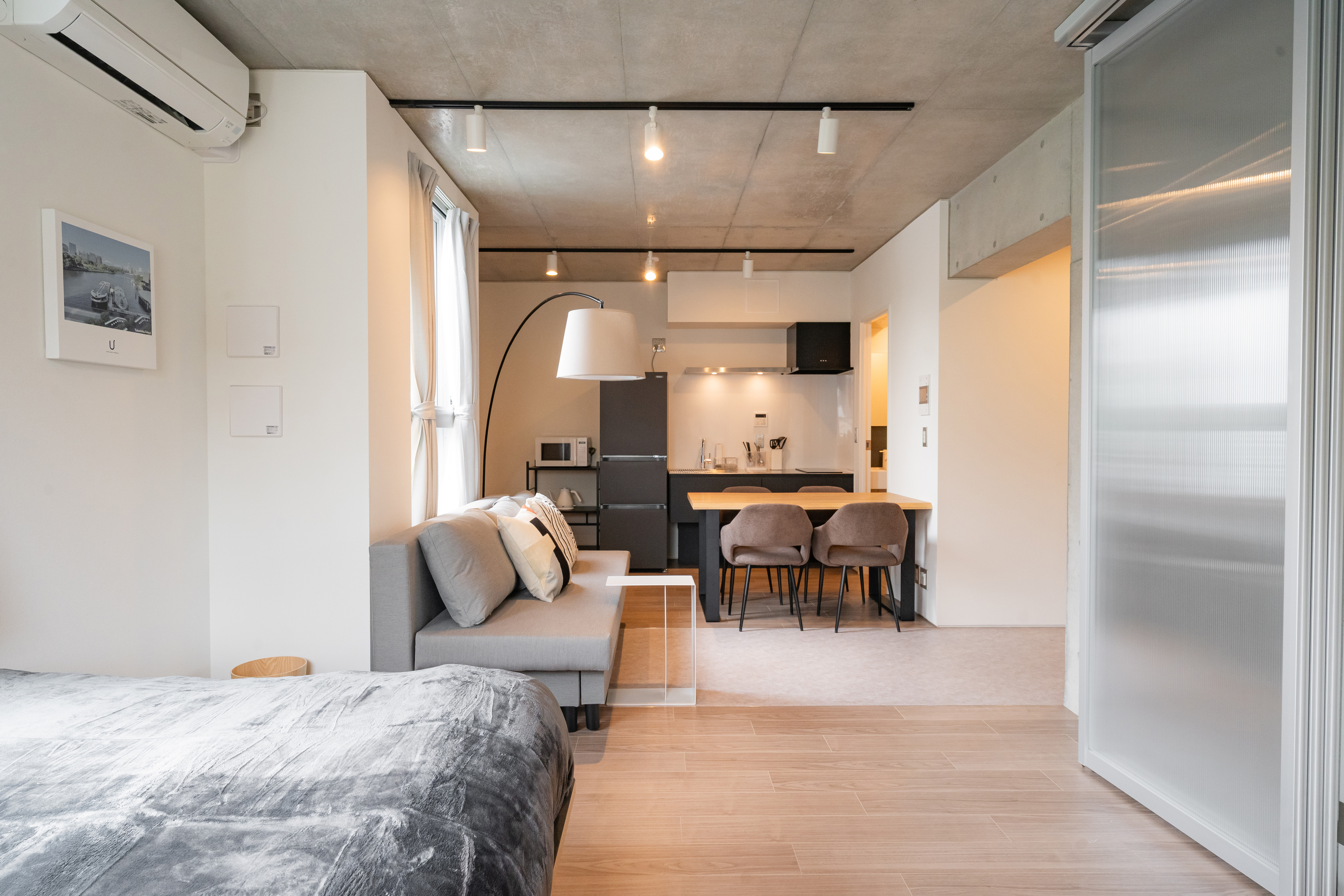 キッチンや洗濯機、家具家電などの充実した設備に加え、一部客室にはプロジェクターを完備し、映画やスポーツ観戦を楽しめます。さらにオートロックや宅配ボックスも備え、安心で快適な暮らしを実現します。最大6名まで滞在可能な居室もあり、家族やグループでの長期滞在にも最適です。