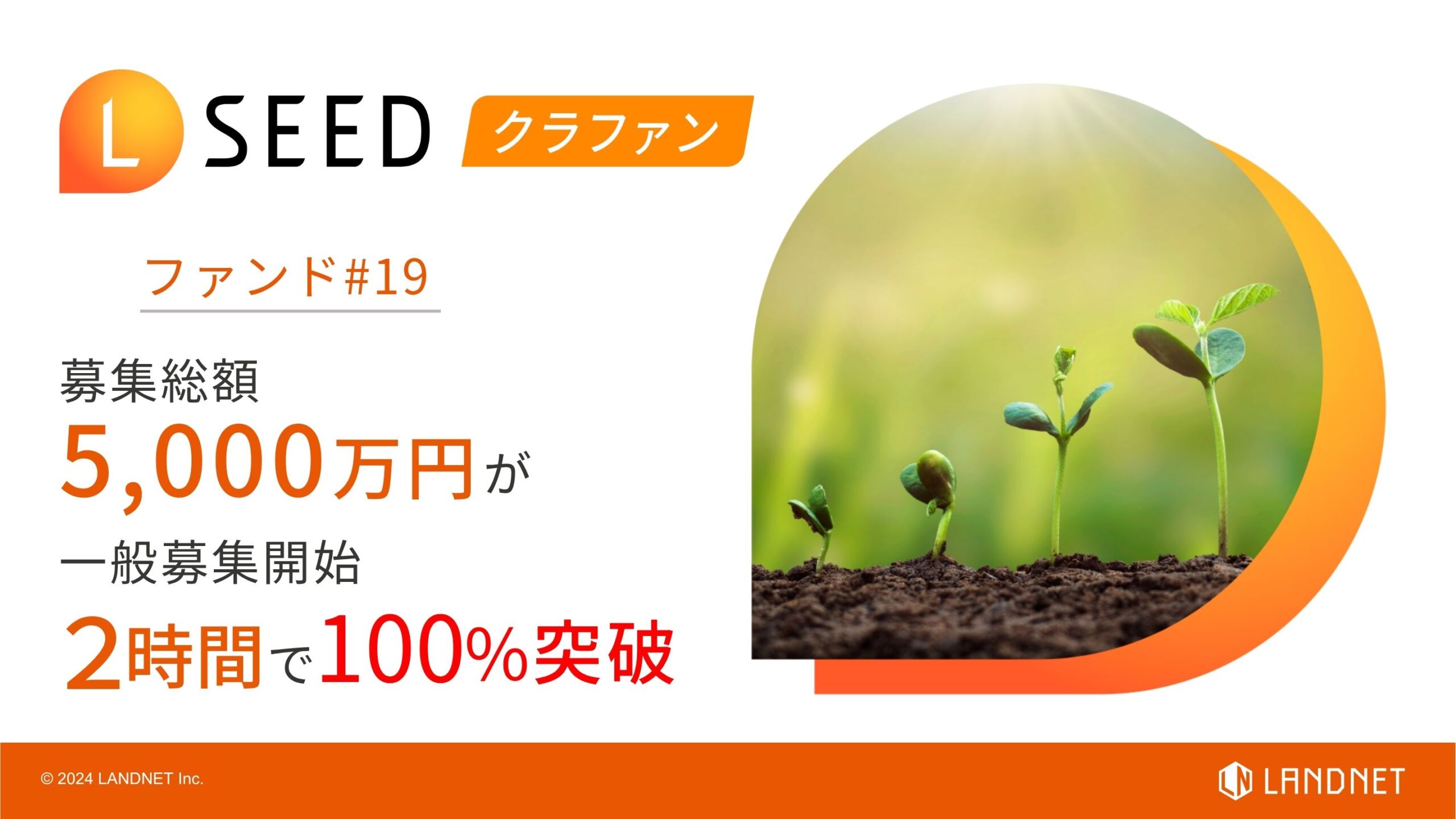 最新テクノロジーと独自のデータベースを活用した「ダイレクト不動産」として不動産の流通、再生、運用に新たな価値を提供する株式会社ランドネット(本社:東京都豊島区/代表取締役社長:榮 章博、証券コード:2991、以下ランドネット)は、不動産投資クラウドファンディング 『LSEED (エルシード)#19』 の募集総額 5,000万円が、一般募集開始から2時間で応募率100%に達したことをお知らせいたします。
