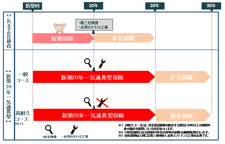 これまでの住宅瑕疵保険は、新築時に掛けられる保険期間が最長で10年でした。10年目に第三者検査と必須メンテナンス工事を行った物件のみが延長保険(11年目以降の10年)に加入することができ、延長保険を含めても最長で20年が上限でした。しかし、今回、渡邊工務店が登録事業者になった「まもりすまい新築20年一気通貫型保険」は、新築引渡し時に20年の住宅瑕疵保険が掛けられます。さらに20年目に第三者検査と必須メンテナンス工事を行うことで、10年ごとの延長保険に加入でき、その後も同様の検査・工事を行うことで、エンドレスで延長が可能となります。