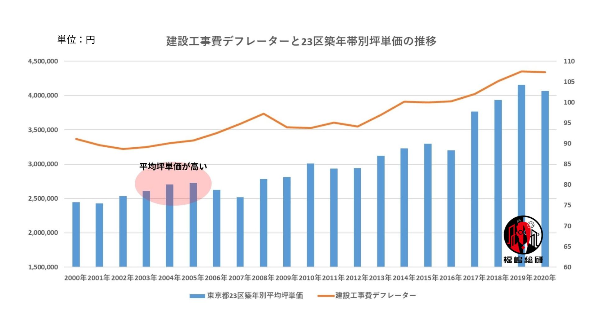 グラフ3:建設工事費デフレーターと23区築年帯別坪単価の推移