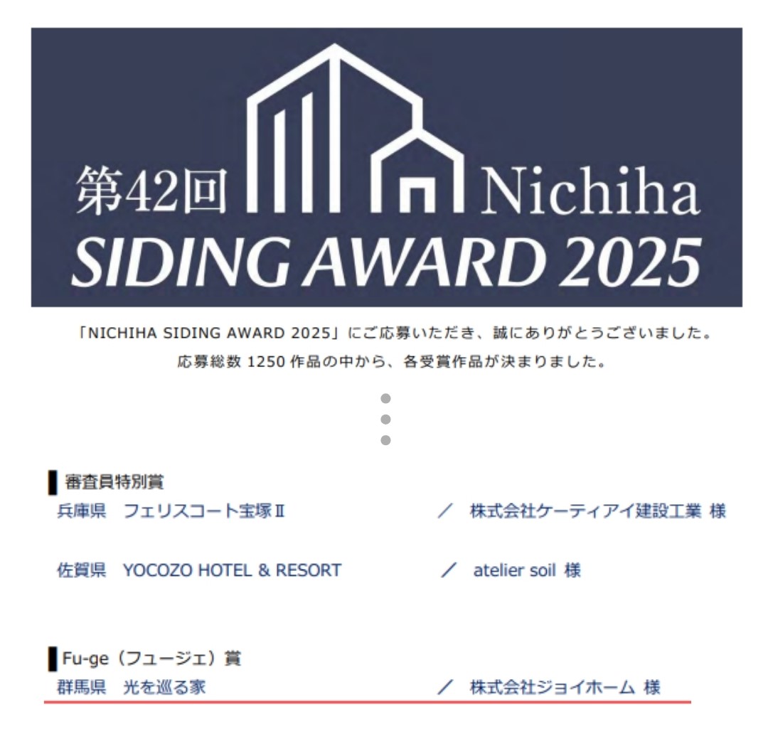 住宅設計・施工の株式会社ジョイホーム(ジョイホームデザイン)は、「NICHIHA SIDING AWARD 2025」で住宅作品「光を巡る家」がFu-ge賞を受賞しました。