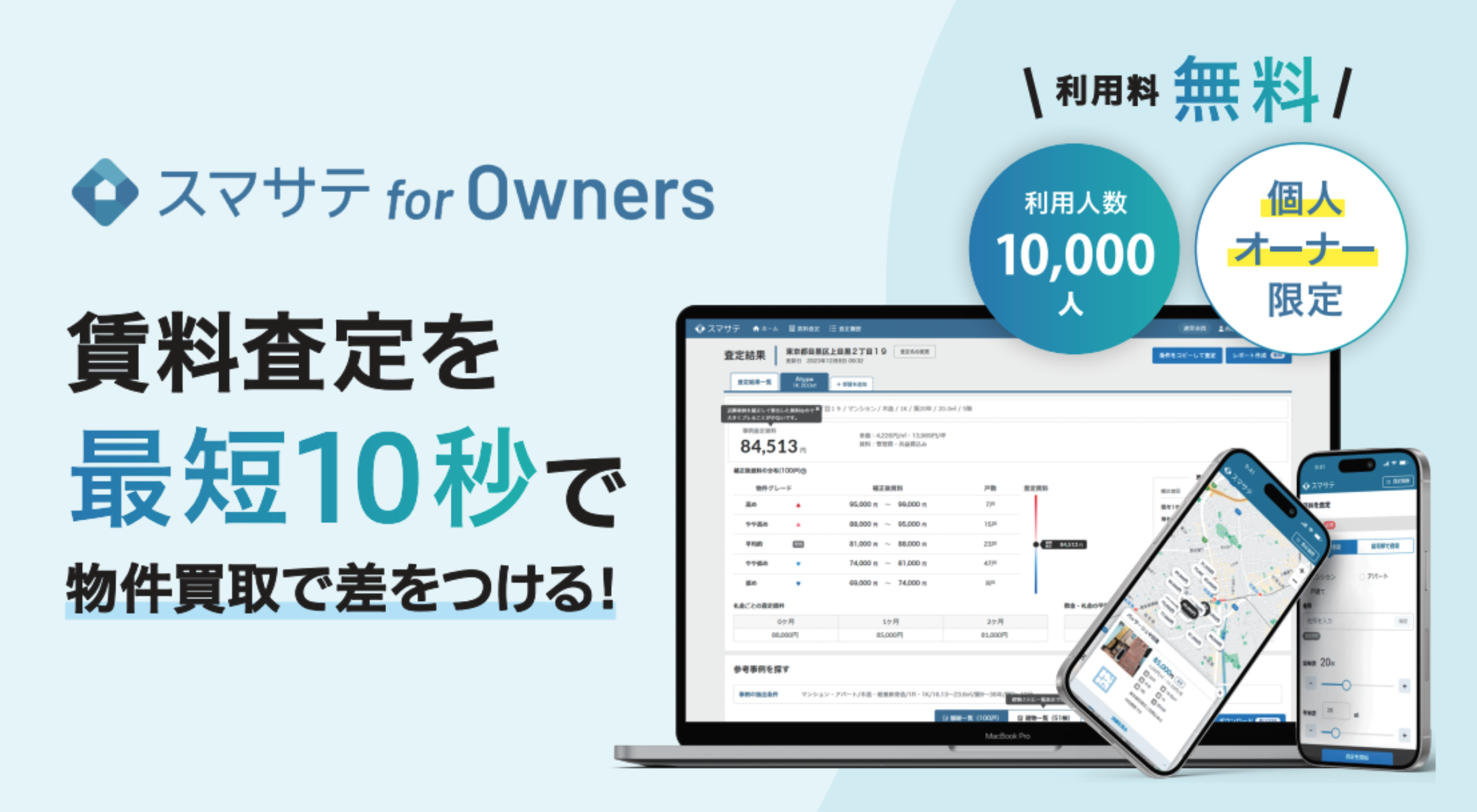 10,000名以上の不動産オーナーに利用されている賃料査定システム、「スマサテ for Owners」。物件取得時や家賃相場を調べるのに最適なツールです。