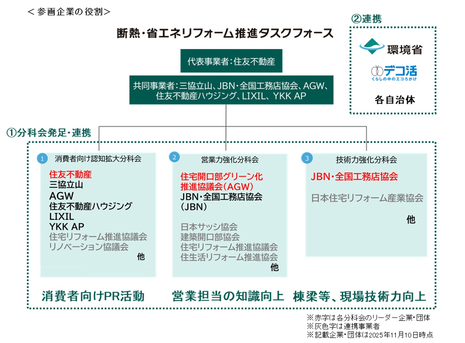 断熱・省エネリフォーム推進タスクフォース(以下「本TF」)は、住友不動産株式会社を代表事業者とし、三協立山株式会社、JBN・全国工務店協会、住宅開口部グリーン化推進協議会(AGW)、住友不動産ハウジング株式会社、株式会社LIXIL、YKK AP株式会社と連携して発足した、既存住宅の断熱・省エネリフォーム普及を目指す団体です。