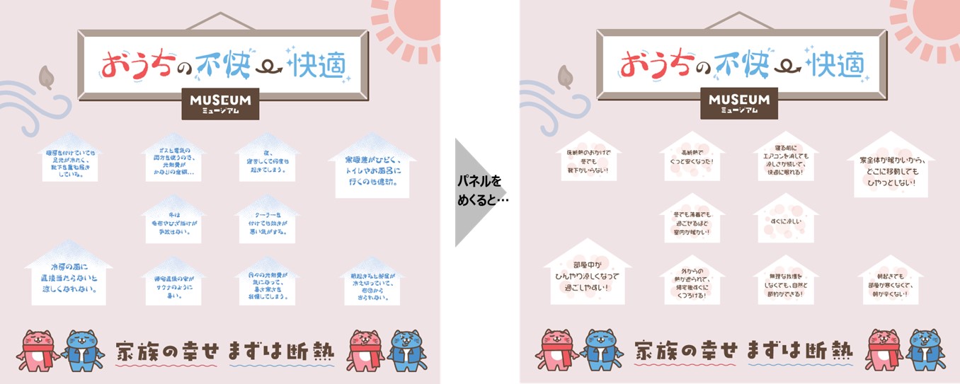 会場では、断熱の仕組みや効果をわかりやすく紹介する展示のほか、猫のキャラクター「あったかいねぇこ・すずしいにゃ~こ」と一緒に楽しめるコンテンツもご用意。「今の家でもできる断熱リフォーム」がわかる内容になっています。