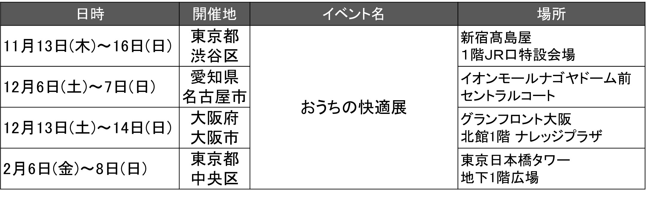 東京・大阪・名古屋では、断熱・省エネリフォーム推進タスクフォースが主催する、暮らしの快適性を見つめ直す体験型イベント「おうちの快適展」を行います。今回の新宿会場での開催を皮切りに、名古屋・大阪・東京日本橋の計4会場で順次実施予定です。