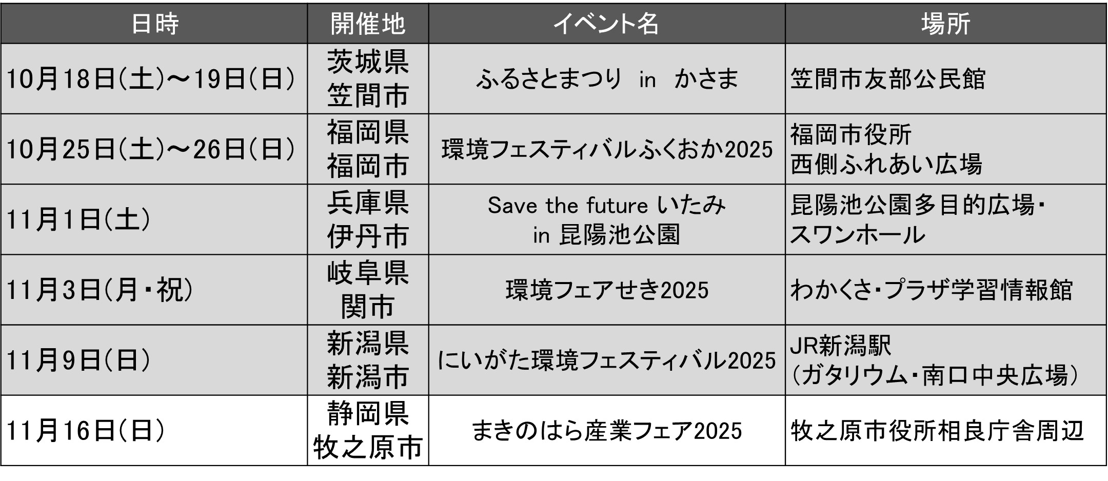 茨城県笠間市の「ふるさとまつり」では約2,900名、 福岡県福岡市の「環境フェスティバルふくおか」では約1,700名に、 兵庫県伊丹市の「save the future いたみ」では約600名に、 岐阜県関市の「環境フェアせき」では約800名に、新潟県新潟市の「にいがた環境フェスティバル2025」では約500名にご来場いただきました。
