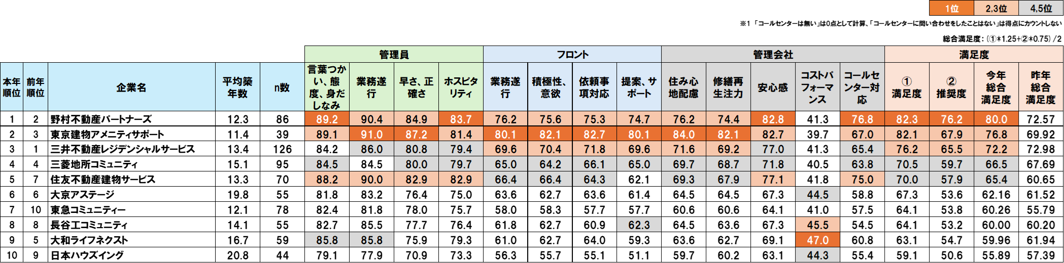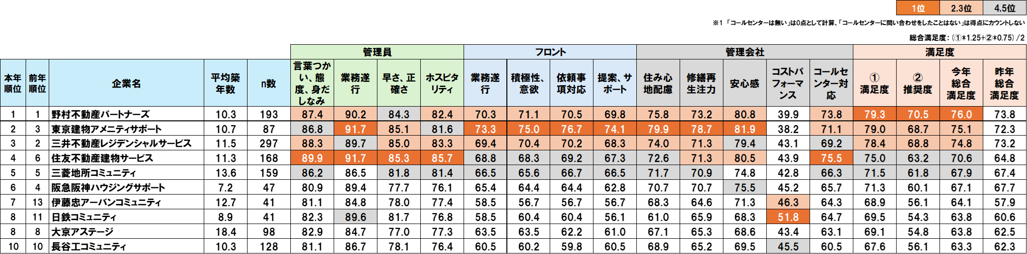 理事経験者による満足度ランキングでも、野村不動産パートナーズが1位を獲得し、総合ランキングとの2冠となった。「管理人」「フロント」「管理会社」などほぼすべての項目でTOP3入りするなど、安定した高評価が特徴。