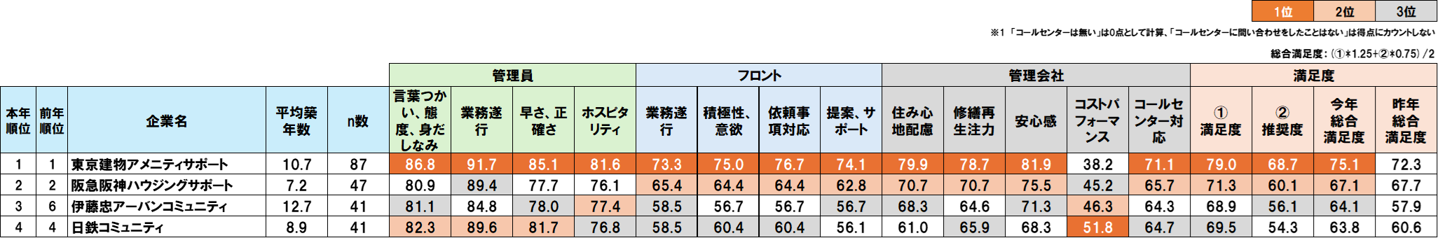「管理人」「フロント」「管理会社」など主要項目において、コストパフォーマンスを除くすべてで1位を達成した。規模を超えたサービス品質が評価され、居住者から非常に高い支持を得ている。