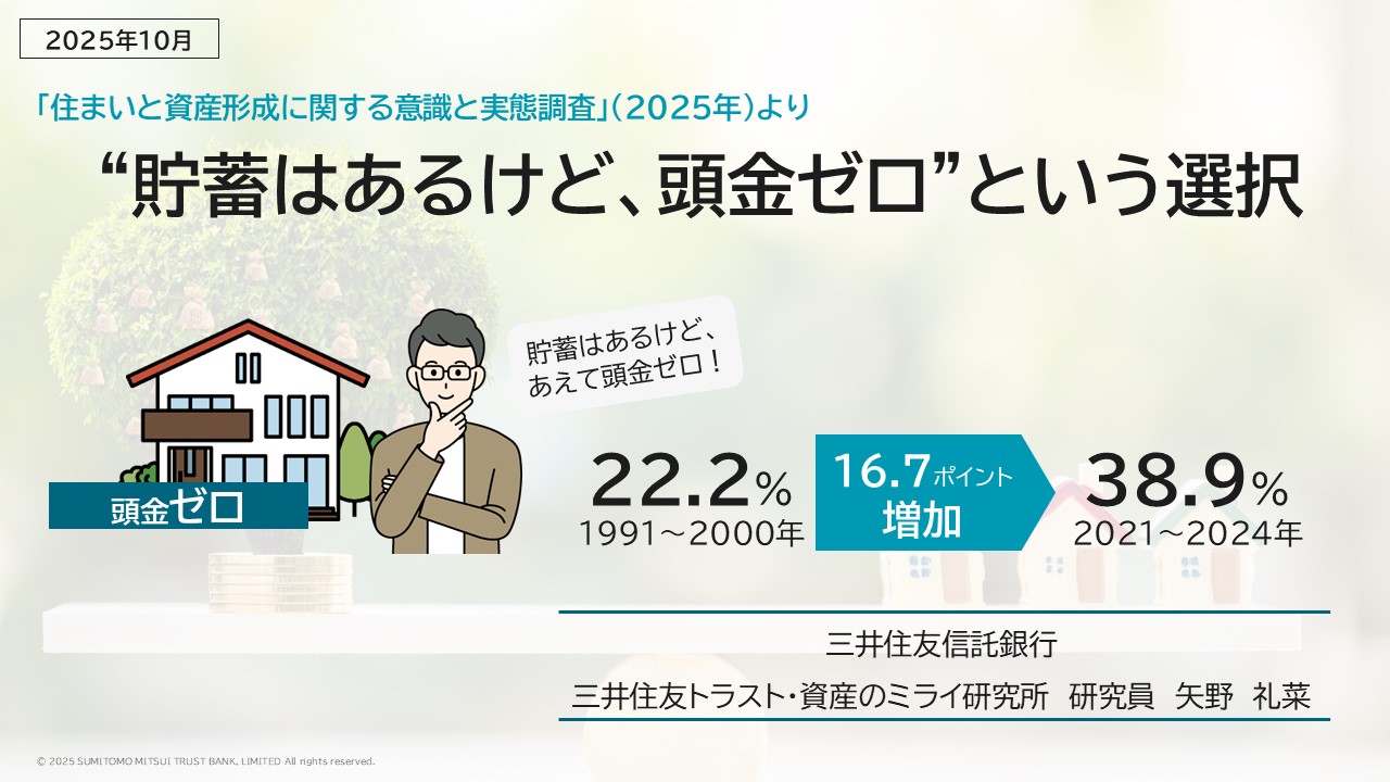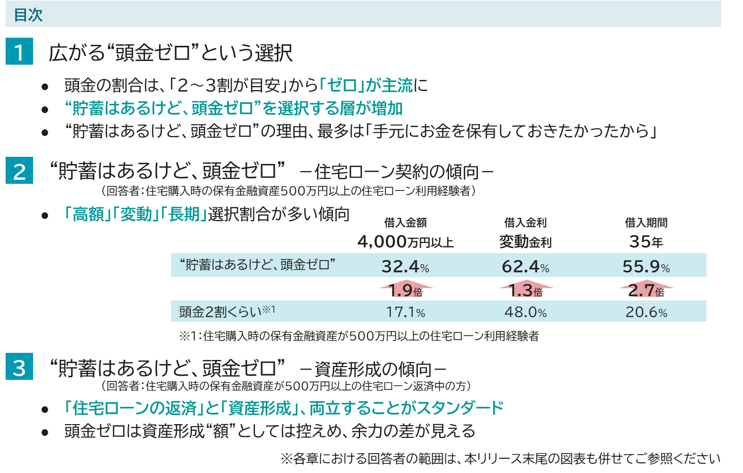 頭金ゼロという選択は、必ずしも資金不足によるものだけでなく、家計戦略や資産形成を見据えて“貯蓄はあるけど、頭金ゼロ”という前向きな選択として広がっている可能性があります。