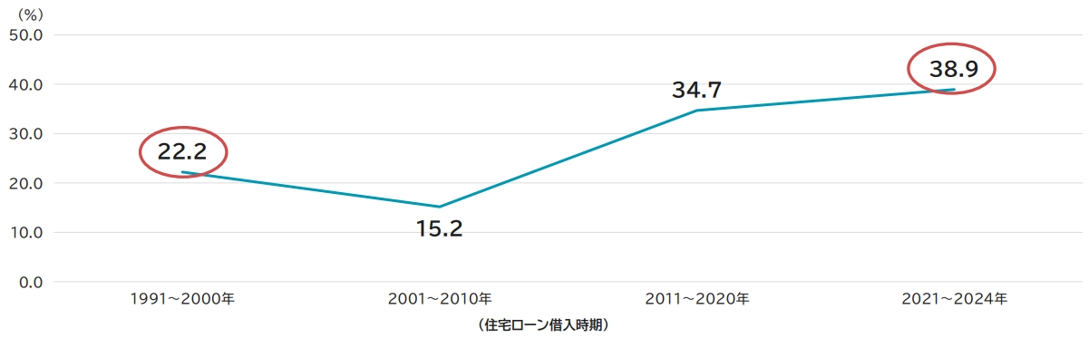そこで、金ゼロを選択した人に、住宅の頭金や諸経費などを支払う前に保有していた金融資産額を尋ねました。その結果、保有金融資産が500万円以上あった人の割合は、住宅ローン借入時期が1991~2000年では22.2%だったのに対し、2021~2024年では38.9%へと16.7ポイント増加していることがわかりました(図表2)。