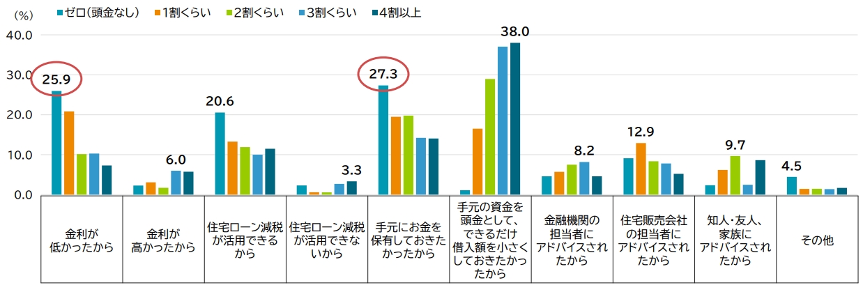 実際に、“貯蓄はあるけど、頭金ゼロ”を選択した人に頭金割合の選択理由を確認したところ、「手元資金の確保(27.3%)」が最も多く、次いで「金利の低さ(25.9%)」が挙げられました(図表3)。