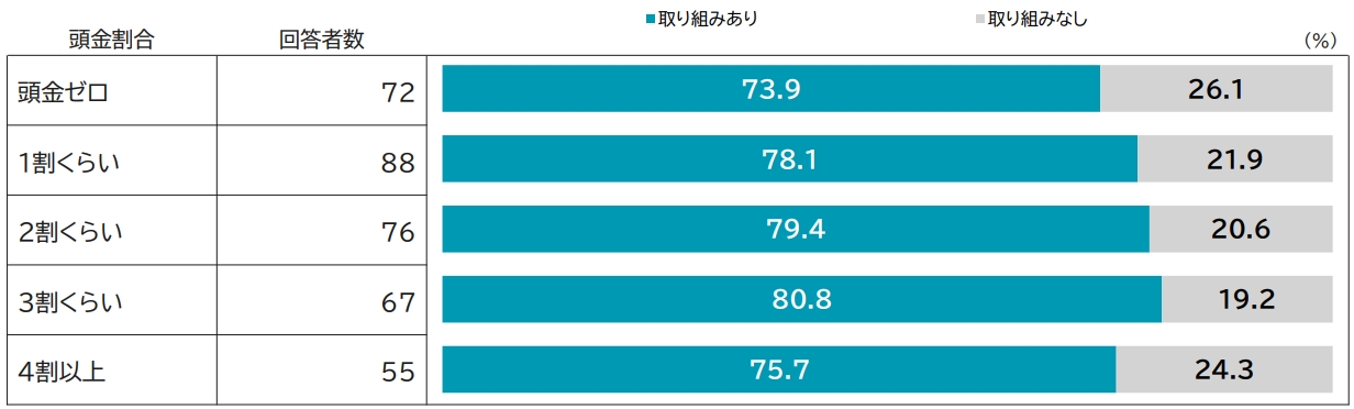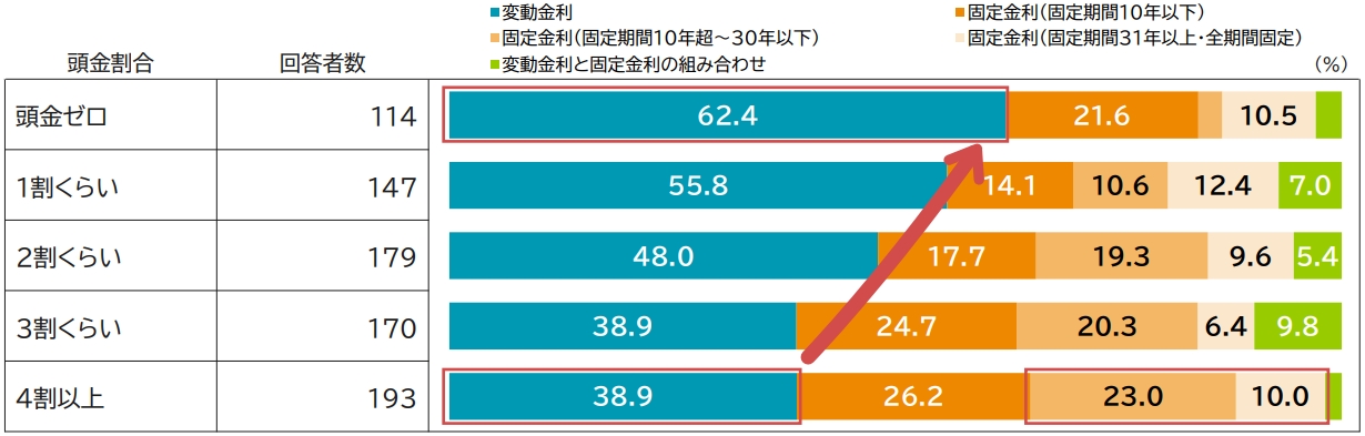 では、“貯蓄はあるけど、頭金ゼロ”にした場合、住宅ローン利用や資産形成に何らかの違いが出てくるのでしょうか。「住宅購入時の保有金融資産が500万円以上あった」と回答した人に絞り、頭金割合別の傾向を確認しました。
