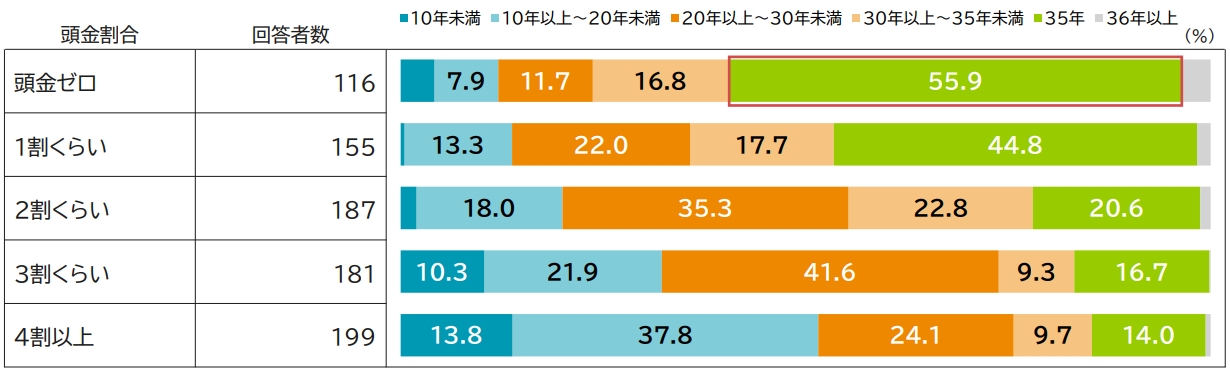 借入期間についても、頭金ゼロでは「35年」での借入れが55.9%と半数を超えており、他と比較しても突出しています(図表6)。頭金割合が増えるにつれて、借入期間が短くなる傾向があり、特に頭金2割以上では、「35年」の借入期間の選択割合が急減しています。