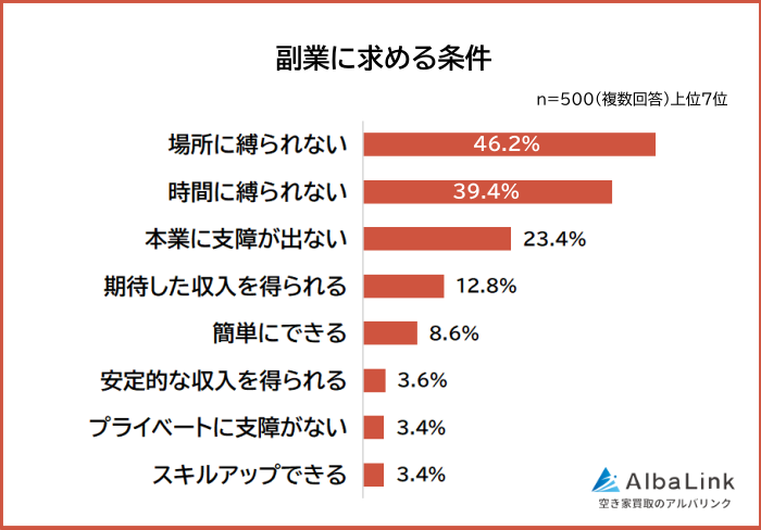 副業に興味がある500人に「副業に求める条件」を聞いたところ、1位は「場所に縛られない(46.2%)」、2位は「時間に縛られない(39.4%)」となっています。