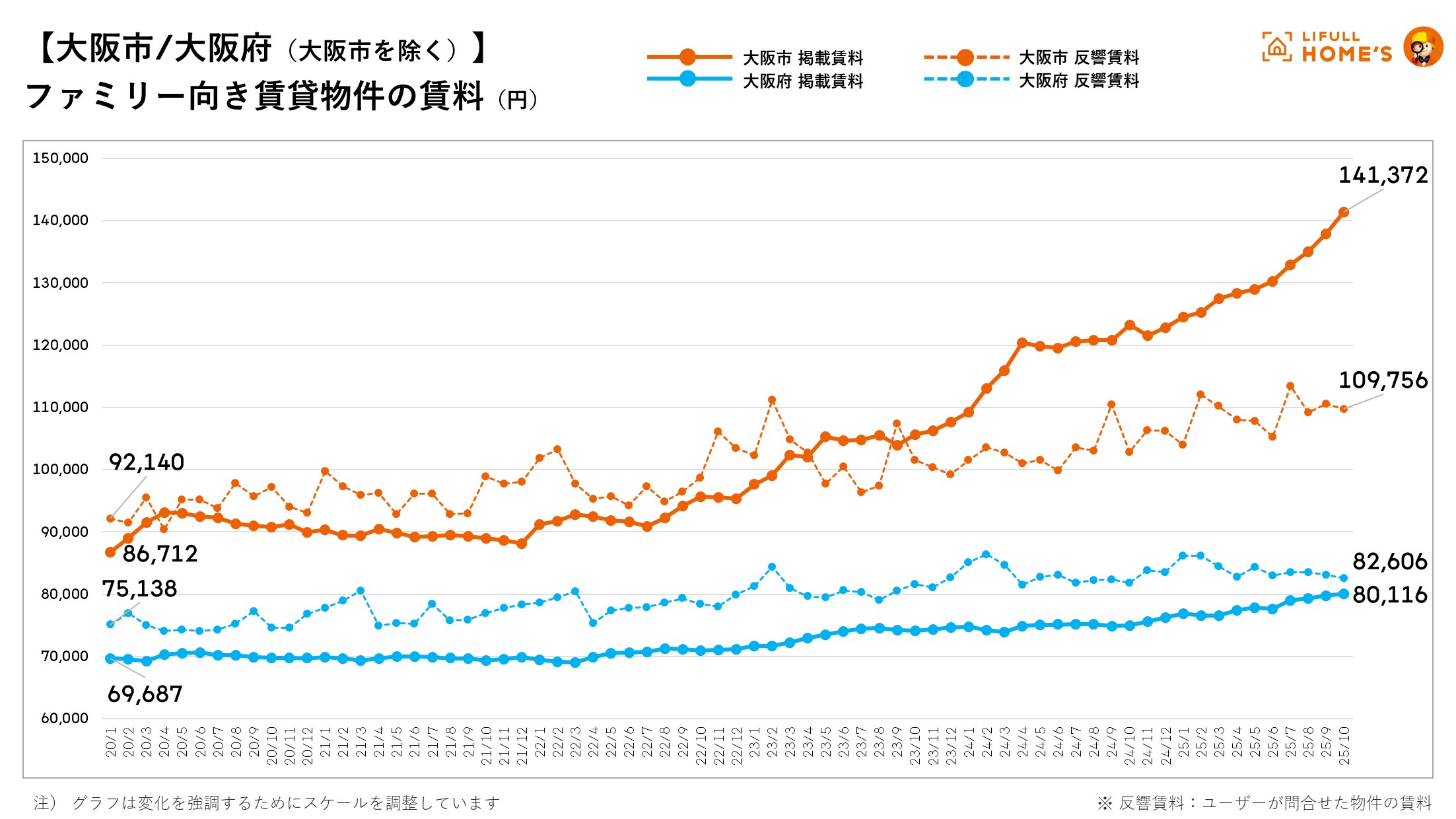 2025年10月の大阪府のファミリー向き賃貸物件の平均掲載賃料は、大阪市で141,372円(前年同月比114.7%)と過去最高賃料を更新し、初めて14万円超えとなりました。大阪市を除く大阪府(以下、「大阪府」)は80,116円(前年同月比106.9%)と過去最高賃料を更新し、大阪府・大阪市全体のファミリー向き物件の掲載賃料が上昇しています。また、大阪府の掲載賃料の上昇に伴い、反響賃料の乖離率は-3.0%と最も小さくなっています。