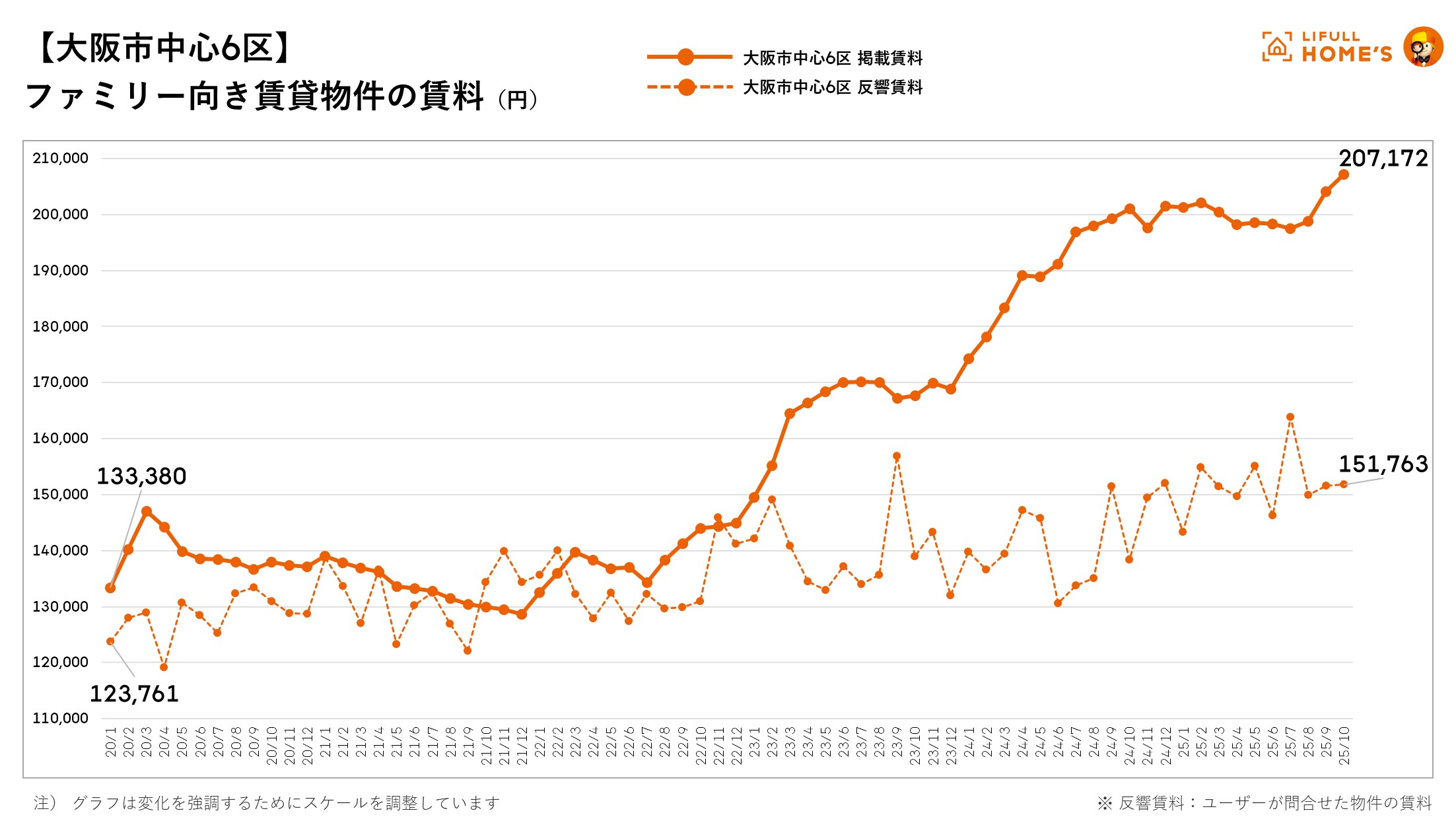 ・大阪市中心6区は20.7万円と最高掲載賃料を更新も、問合せ賃料は横ばい状態。
