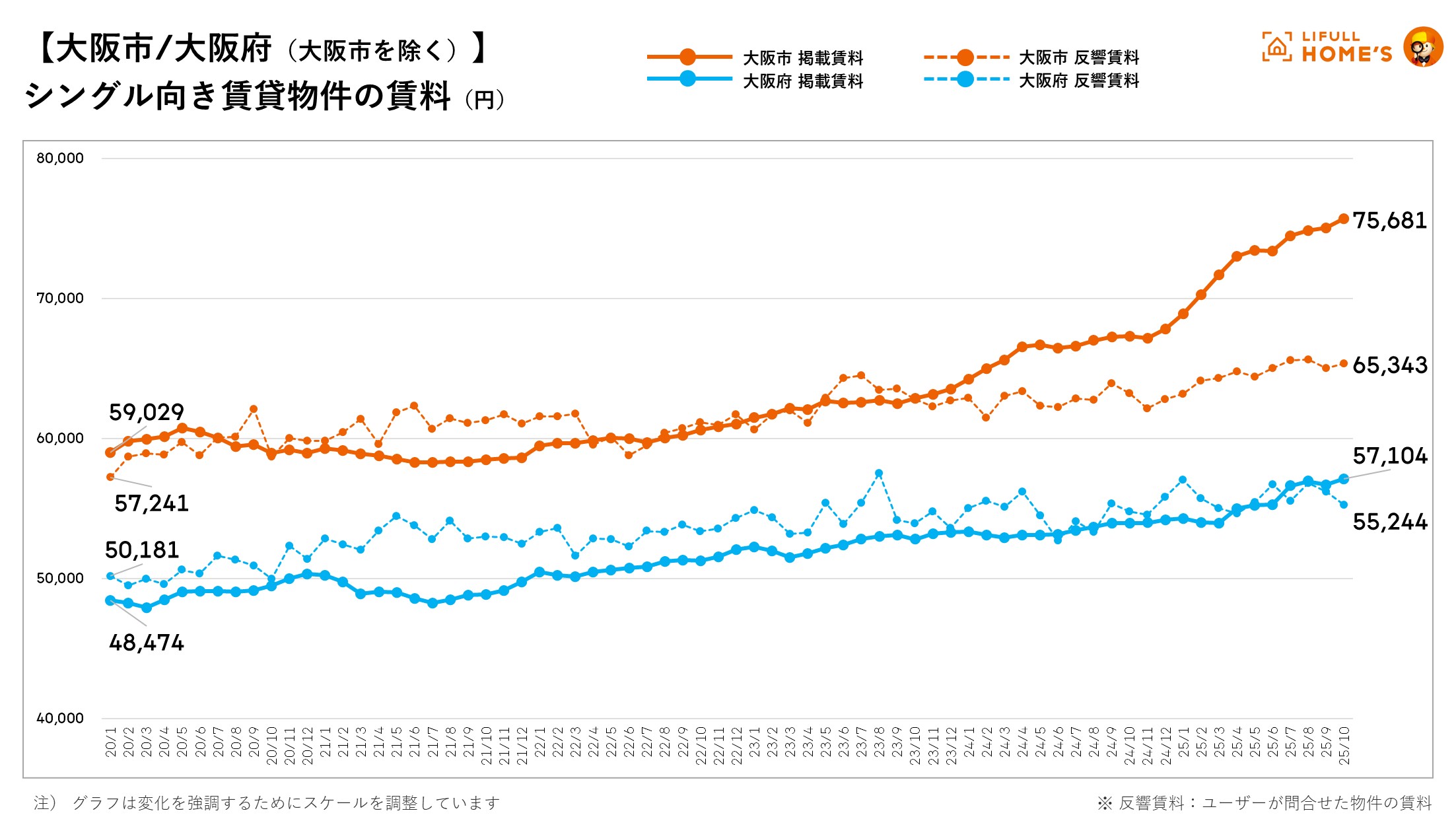 2025年10月の大阪府のシングル向き賃貸物件の平均掲載賃料は、大阪市で75,681円(前年同月比112.4%)、大阪市を除く大阪府(以下、「大阪府」)で57,104円(前年同月比105.8%)となり、過去最高賃料を更新しました。大阪府では掲載賃料の上昇に伴い、掲載賃料が反響賃料を引き続き上回っており、乖離率は3.4%と広がっています。