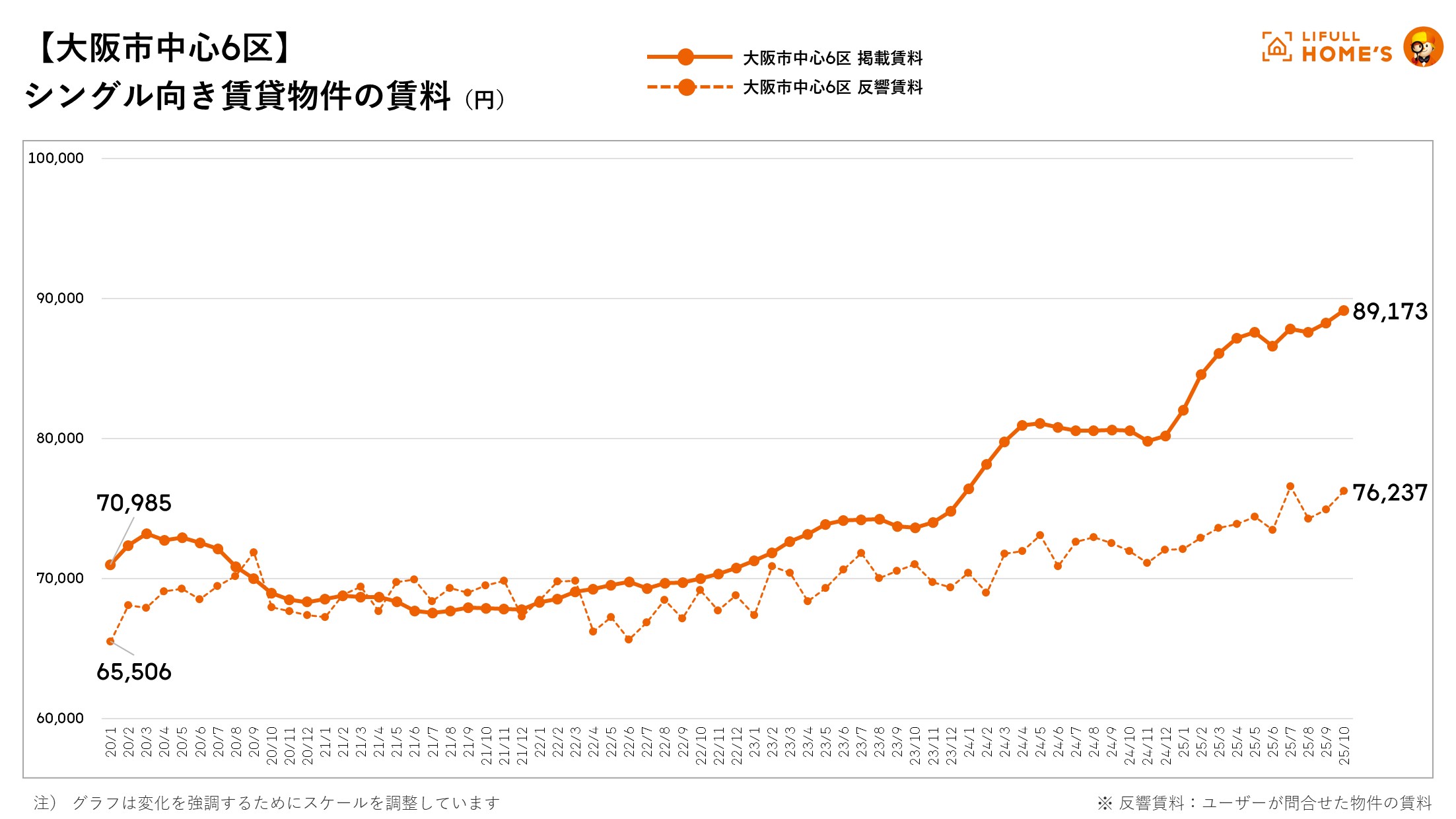 大阪市中心6区(中央区、北区、西区、福島区、天王寺区、浪速区)は89,173円(前年同月比110.7%)も過去最高賃料を更新しました。反響賃料は76,237円(前年同月比105.9%)と上昇基調にあります。