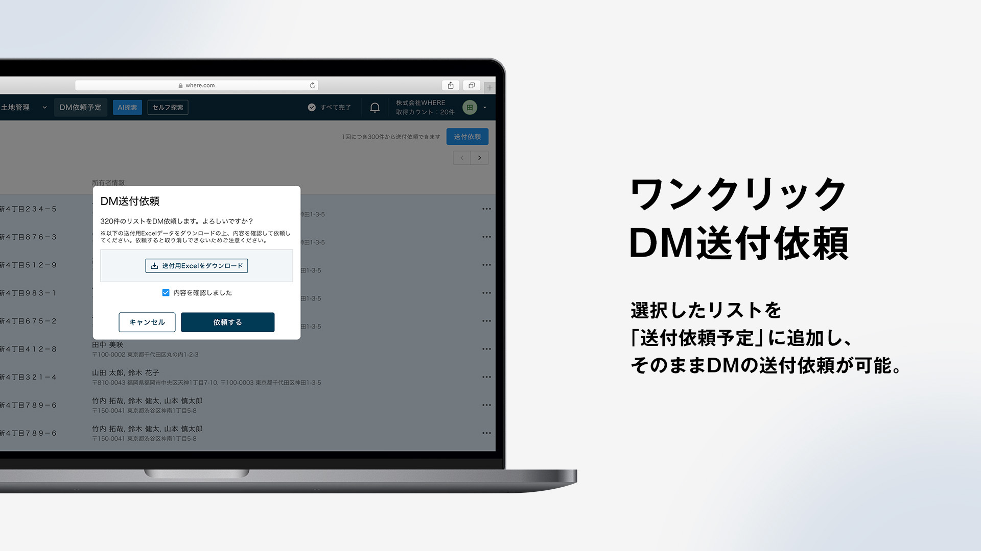 株式会社WHERE(本社:東京都、代表取締役:阿久津 岳生、以下「WHERE」)は、地権者とつながる不動産AIツール『WHERE』において、物件探索からDM送付依頼・進捗管理までをワンストップで行える新機能をリリースしました。