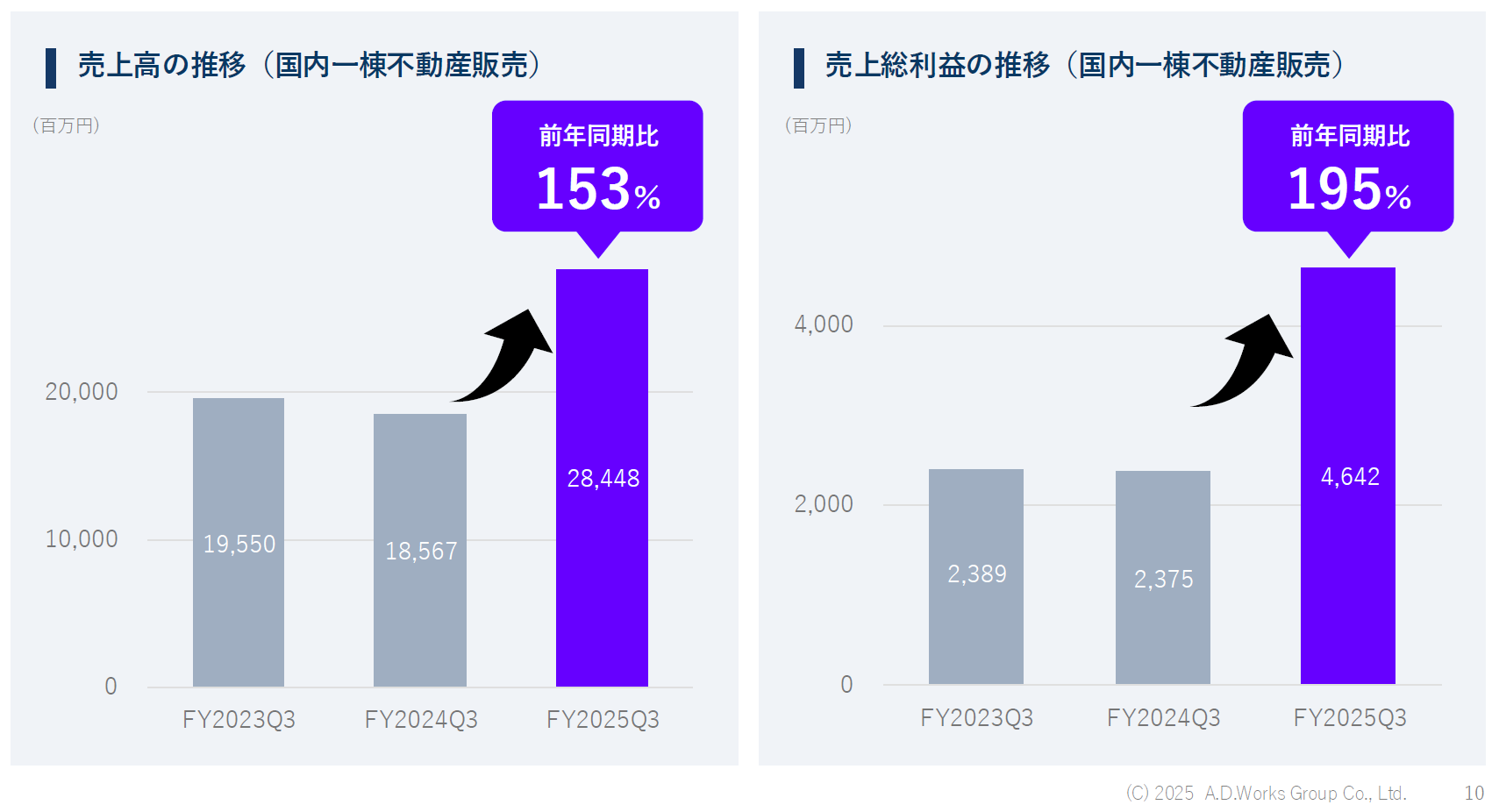 一棟収益不動産販売事業は第3四半期で売上284億円(前年同期比153%)・売上総利益46.4億円(同195%)を達成しました。