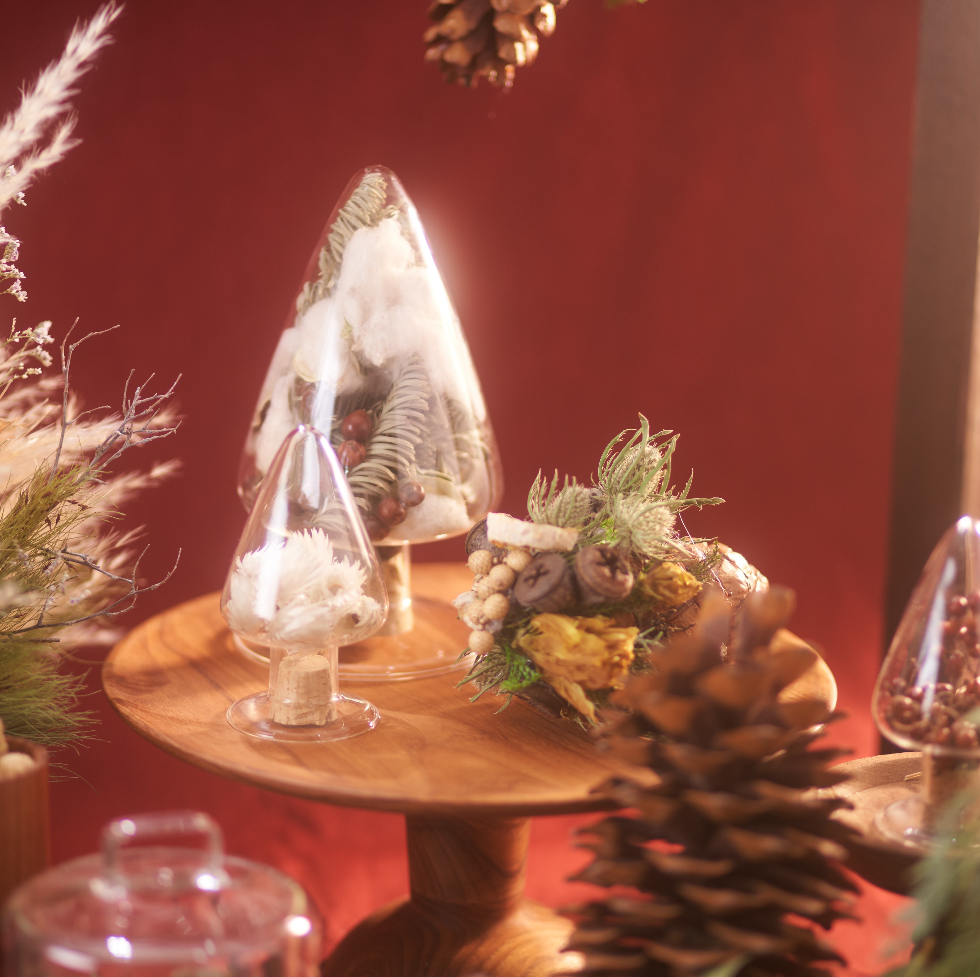 お好みのドライフラワーをお選びいただき、ガラスのクリスマスツリーを作成できます。お部屋をさりげなくクリスマスカラーに染めてくれるアイテムです。