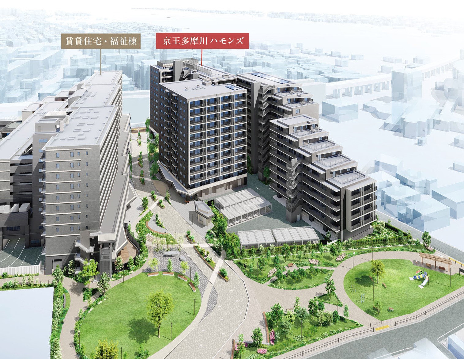 第1号物件となる「京王多摩川ハモンズ」(京王多摩川駅徒歩2分/264戸)は、京王多摩川駅前にて推進する駅前一体開発エリア「itonami」内に誕生します。「itonami」は、旧京王フローラルガーデンアンジェ跡地など約2.8haの敷地および京王多摩川駅と駅高架下を含む範囲が対象です。土地区画整理事業と併せてA棟(今後計画予定)・B棟(賃貸住宅・福祉棟)・C棟(分譲住宅棟:京王多摩川ハモンズ)の計3棟の建物を開発するほか、京王多摩川駅の駅舎改良工事、高架下スペースの暫定利活用を行いながら、段階的に開発を進めています。