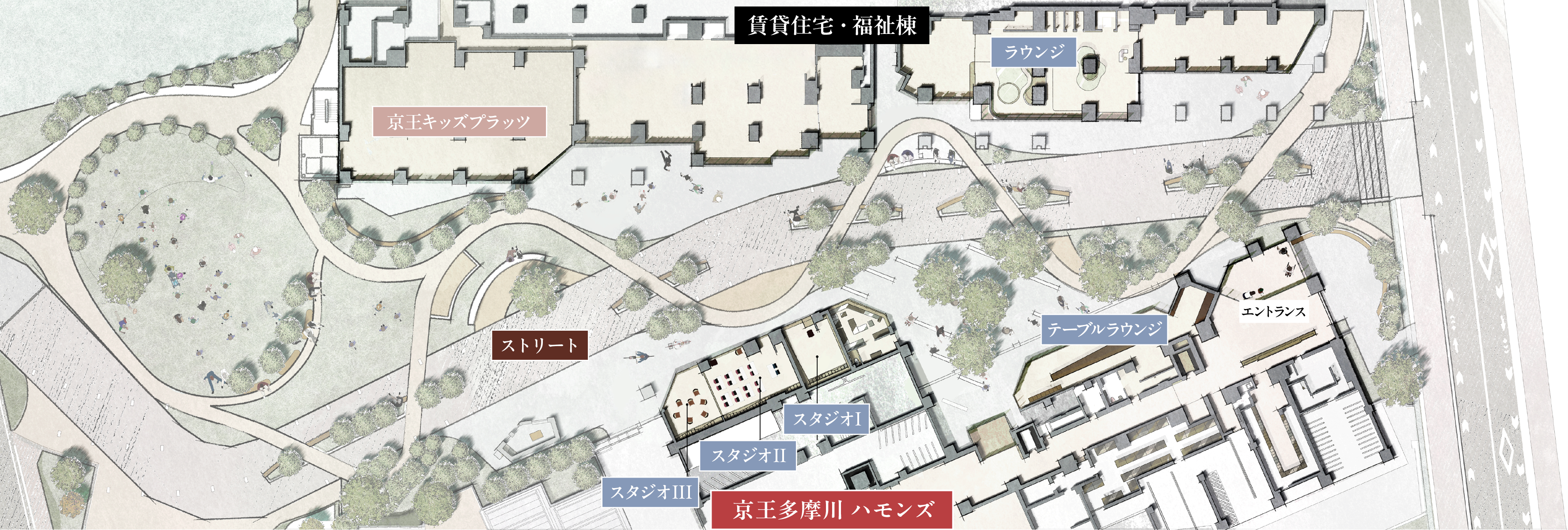 ・「ラウンジ」     :隣接する賃貸住宅・福祉棟の共用施設を京王多摩川ハモンズの入居者も