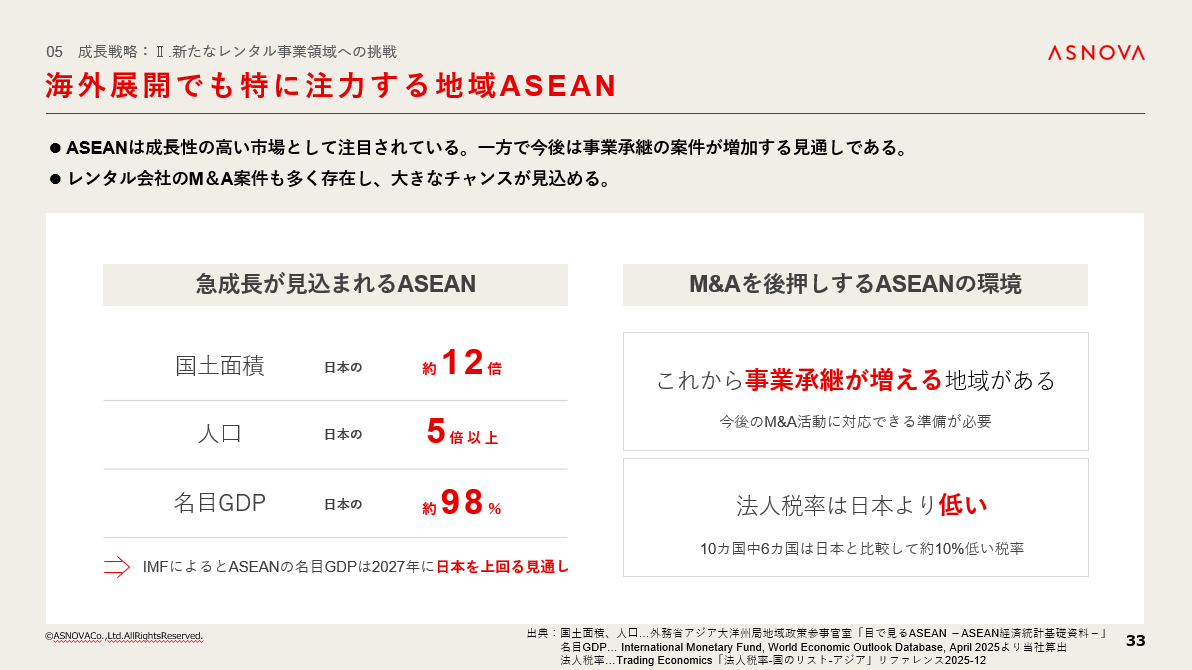 特にASEAN地域は、成長性の高い市場として世界的に注目されており、今後も継続的な経済発展が期待されています。一方で、同地域では事業承継を背景としたM&A案件の増加が見込まれている地域もあり、当社にとっても新たな事業機会が広がると考えています。
