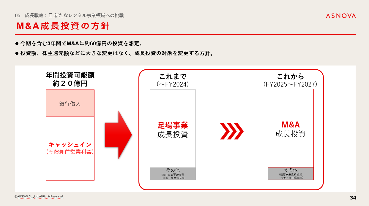 M&Aによる成長投資については、今期を含む今後3年間で約60億円の投資を想定しています。これまで当社は、足場レンタル事業に対して積極的な成長投資を行ってまいりましたが、今後はその投資の方向性をM&Aによる新たなレンタル事業へとシフトしていきます。