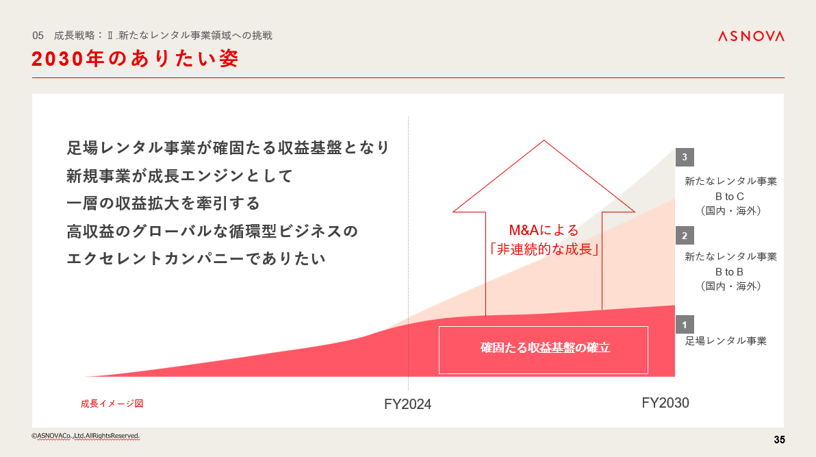 当社は、2~3年後の短期的な中期経営計画を発表する代わりに、より長期的な視点で「2030年のありたい姿」を策定しています。これまで当社が磨き上げてきた足場レンタル事業を安定的な収益源としながら、今後はM&Aを通じて“非連続的な成長”を実現し、新たなレンタル事業、特に海外市場への進出を積極的に進めてまいります。