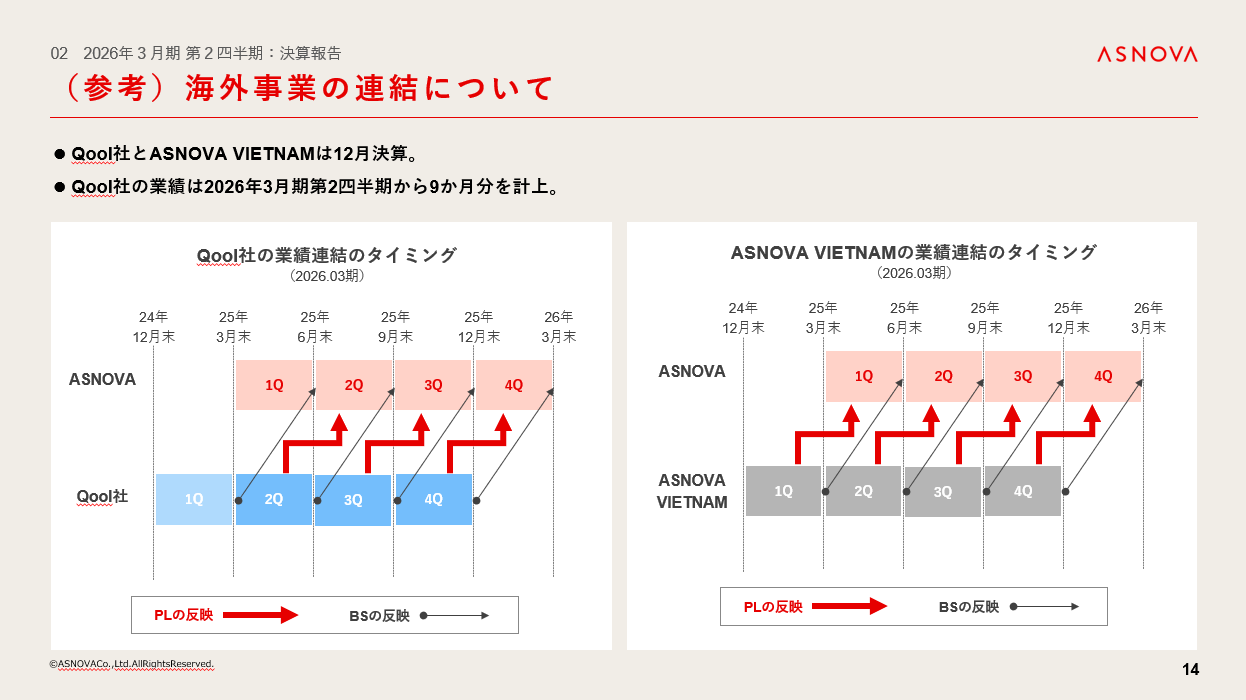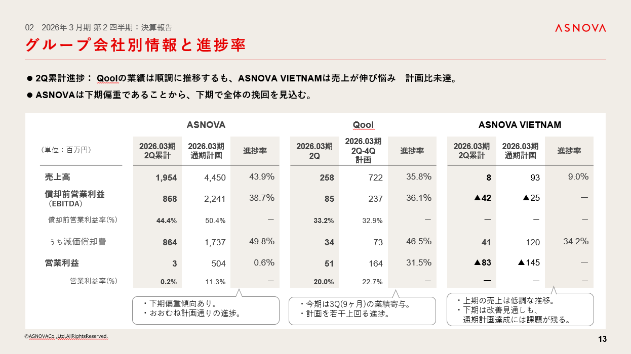 足場レンタルは下期が繁忙期であることから概ね想定通り、Qool社は売上高・償却前営業利益ともに進捗率は30%を超えており、こちらも想定通りの進捗となっております。ASNOVA VIETNAMについて、現在は投資フェーズであり、機材センターの拡張や足場への投資などを行っていることから利益をだすには時間がかかりますが、2030年度の営業利益黒字化を目指します。
