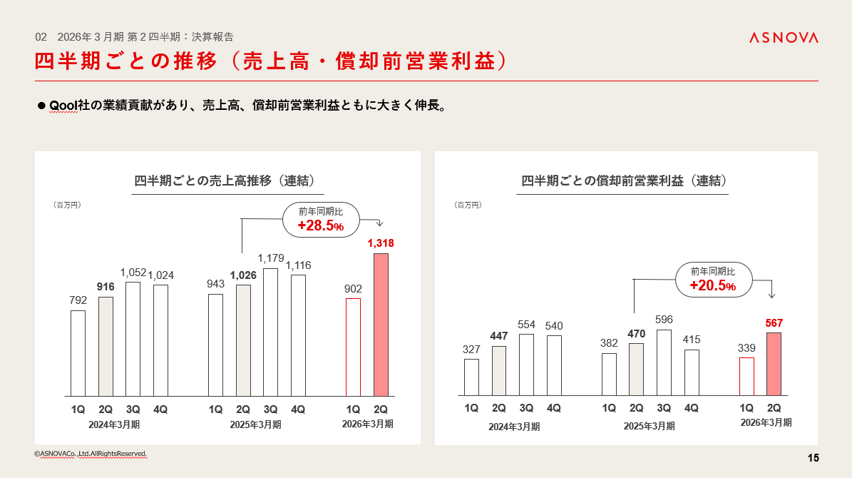 売上高は前年同期比でプラス2億5100万円増の22億2100万円で着地いたしました。償却前営業利益は前年同期比でプラス5300万円増の9億700万円となり、どちらも第2四半期累計業績としては過去最高となっております。2026年3月期第2四半期は、Qool社の主要事業であるトイレレンタル事業において長期契約が堅調に増加しております。