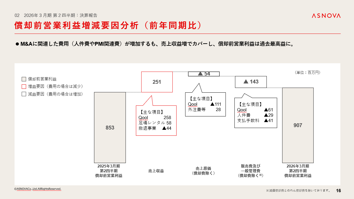 M&Aに関連するPMI費用や人件費など、販管費が大きく増加しましたが、Qool社の売上取り込みと、国内足場レンタル売上の堅調な増加もあり、償却前営業利益は前年同期比で増加しております。初めてのM&Aということもあり関連費用が増加いたしましたが、今後経験を積むことでこれらの費用を削減し、さらに大きく収益力を高めることを目指してまいります。