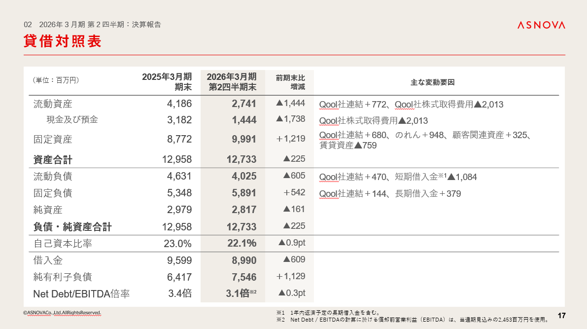 前期末比で現金及び預金が大きく減少した原因は、Qool社の株式取得費用の支払いによるものです。資産合計は前期末比で2.2億円の減少となりました。
