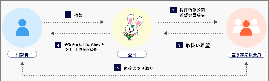 本ネットワークは、当会が全国規模で運営する、空き家に関する相談窓口です。空き家でお困りの方から相談申込を受けた際、空き家に精通した不動産業者(空き家応援会員)をご紹介します。そして、空き家応援会員は、相談者と二人三脚で課題解決に向けた提案と実行までを担います。