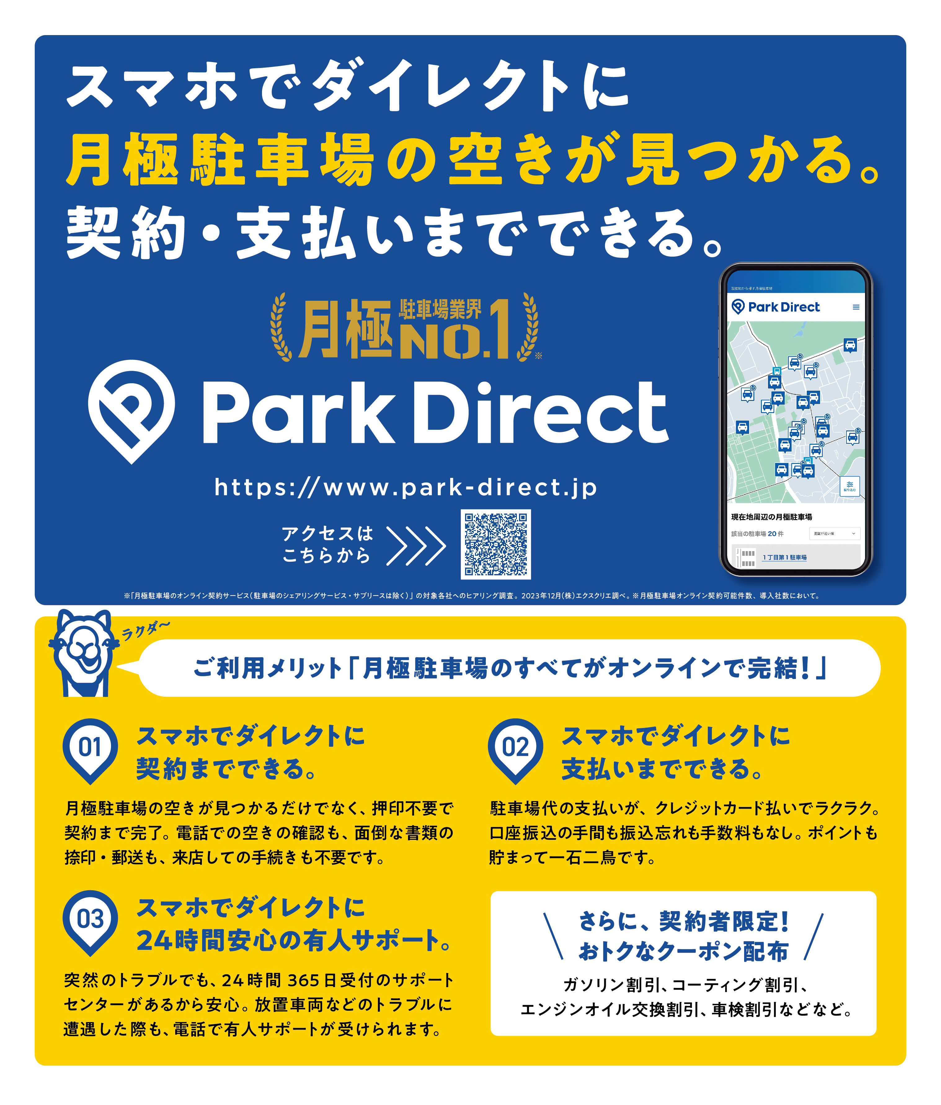 「Park Direct(パークダイレクト)」(https://www.park-direct.jp)は、株式会社ニーリーが運営する、月極駐車場をオンラインで検索・申込・契約できるサービスです。スマホやパソコンから現在地や住所で簡単に検索でき、オンラインで申込、契約、クレジットカードでの決済まで可能。最短約5分で月極駐車場をご利用いただけます。また、希望する駐車場が満車の場合でも「空き待ち予約」をすれば、空きが出た際にお知らせを受け取れます。Park Direct(パークダイレクト)は、オンライン契約可能台数業界No.1(※1)!
