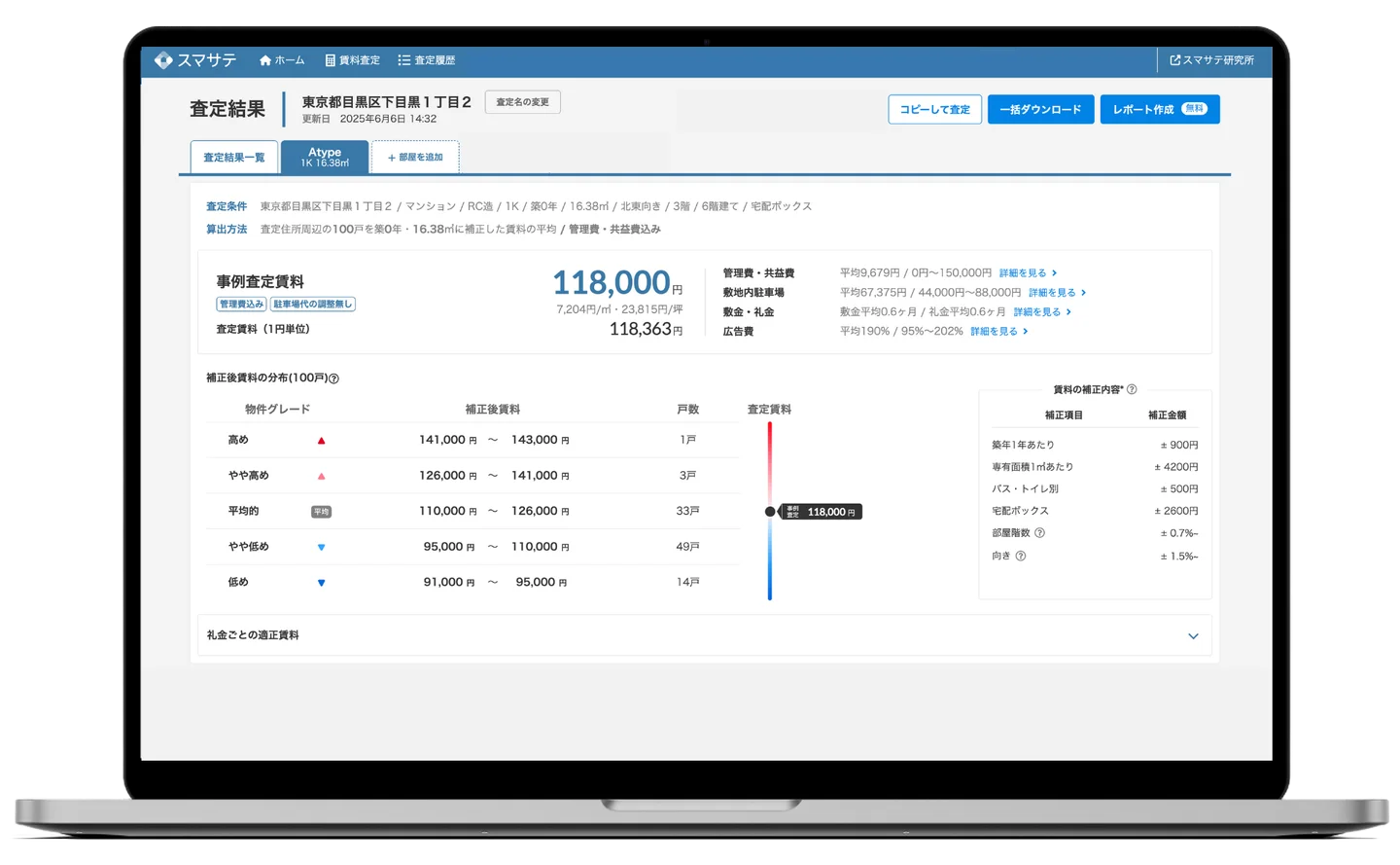 「スマサテ」は簡単な操作で、高精度な賃料査定とその根拠となる周辺事例の抽出、土地活用提案に最適な書類やレポートの作成業務を一瞬で完了できる、AI搭載の賃料査定システムです。導入社数は3900社を超え、無料からでも利用が可能です。