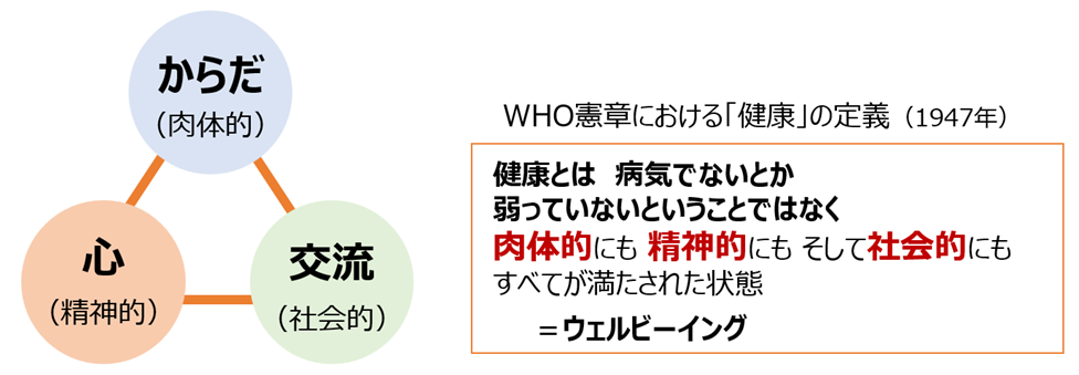WHO憲章における「健康の定義」では、「健康とは、病気でないとか、弱ってないということではなく、肉体的にも精神的にも、そして社会的にもすべてが満たされた状態(日本WHO協会訳)」としており、これを「ウェルビーイング」であるとしています。シニア期の健康というと、からだ(肉体的)に焦点を当てることが多いですが、本調査では、心(精神的)と交流(社会的)も含めた3つのバランスがほどよく取れていることが真の健康であると捉えます。