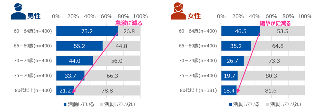 一方で、女性で就労・社会参加活動を行う割合は、世代の傾向として男性のようなフルタイム勤務が主流でなく、パートタイム勤務やボランティア活動を行う人も多いせいか、その減り方は緩やかです。