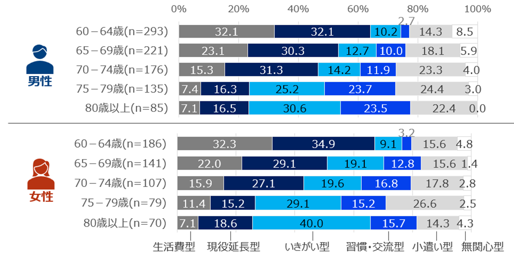 男女共に年齢が上がるにつれて経済的必要性が低くなり、「生活費型」や「現役延長型」から自己充足が高めである「いきがい型」にシフトしていきます。特に女性の場合、75-79歳、80歳以上では、「いきがい型」が最も多くなります(3~4割)。