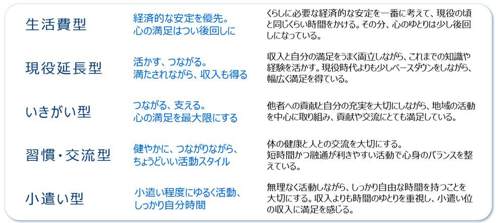 「生活費型」「現役延長型」「いきがい型」「習慣・交流型、「小遣い型」「無関心型」