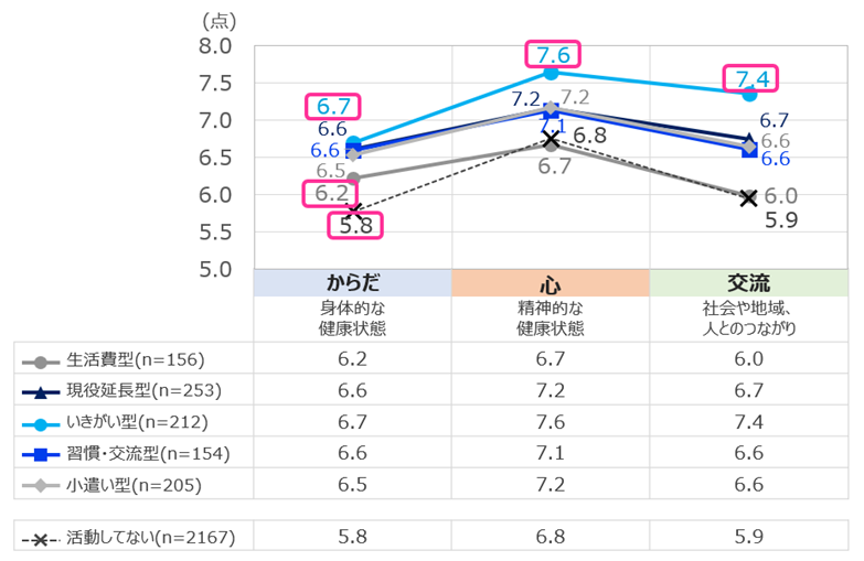 「いきがい型」は、「からだ」「心」「交流」の3項目ともに最も満足度が高く、就労・社会参加活動をすることが「健康を支えること」となっています。一方で「生活費型」と「活動してない」はこれら3項目ともに低めで推移しており、特に「からだ」は「活動してない」で満足度が最も低く、活動を何もしないのは、やはり良くないということを示唆しています。なお、「現役延長型」、「習慣・交流型」、「ほどほど型」の3タイプの傾向は、ほぼ変わらないことが分かりました。ただし、重視する点はそれぞれ異なるので、自分にあったタイプを選ぶと良いでしょう。