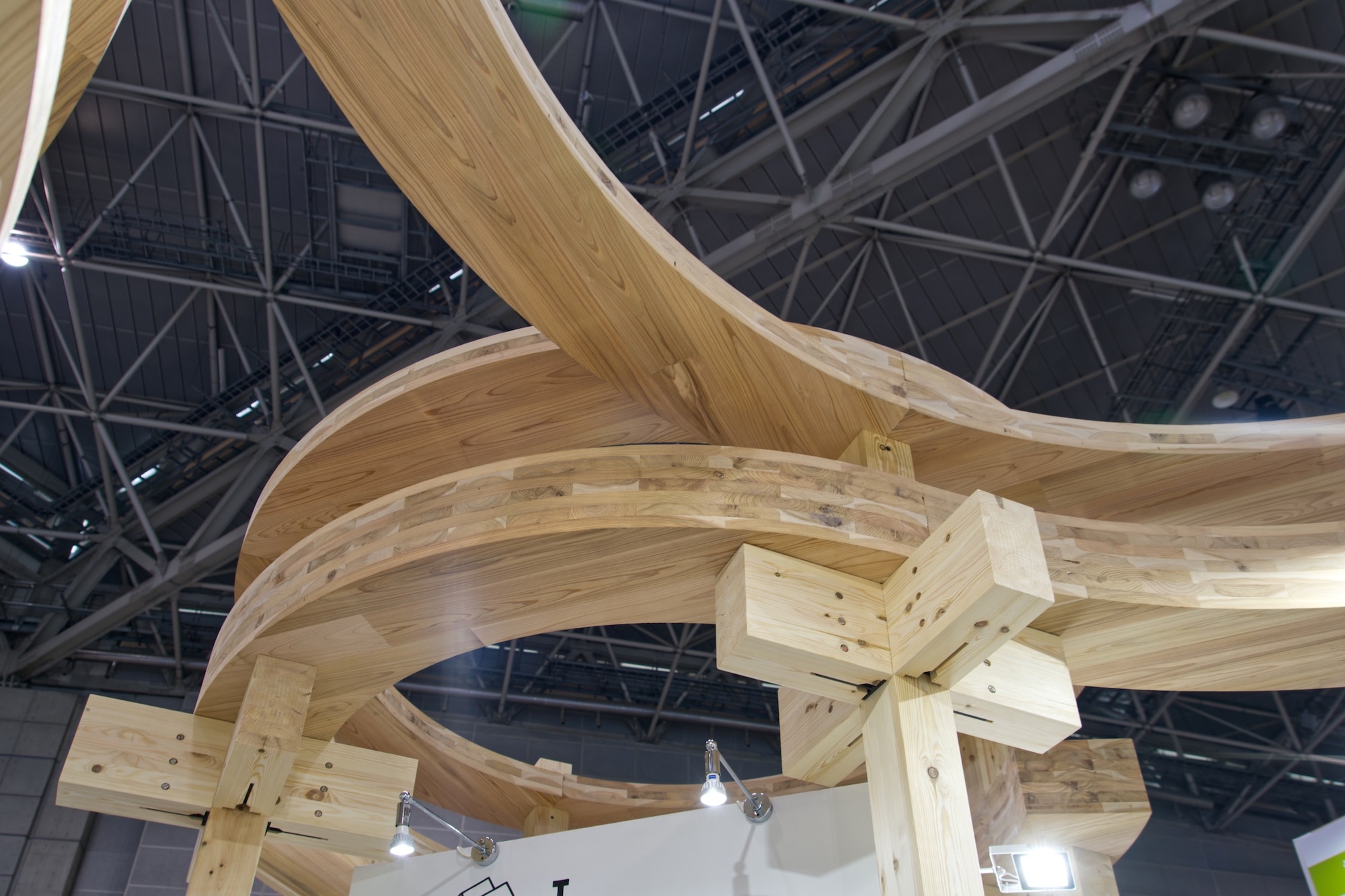 エヌ・シー・エヌが「非住宅 木造建築フェア2025」で、木造建築の魅力と可能性を発信した展示ブースのデザインは、グループ各社の技術やサービスや事業のつながりを円状のモチーフで表現し、多くの来場者に注目されました。設計は自社で行い、制作はグループ会社の株式会社翠豊(岐阜県賀茂郡)が、CLT(直交集成板)を精密に加工し美しい曲線を作り上げました。