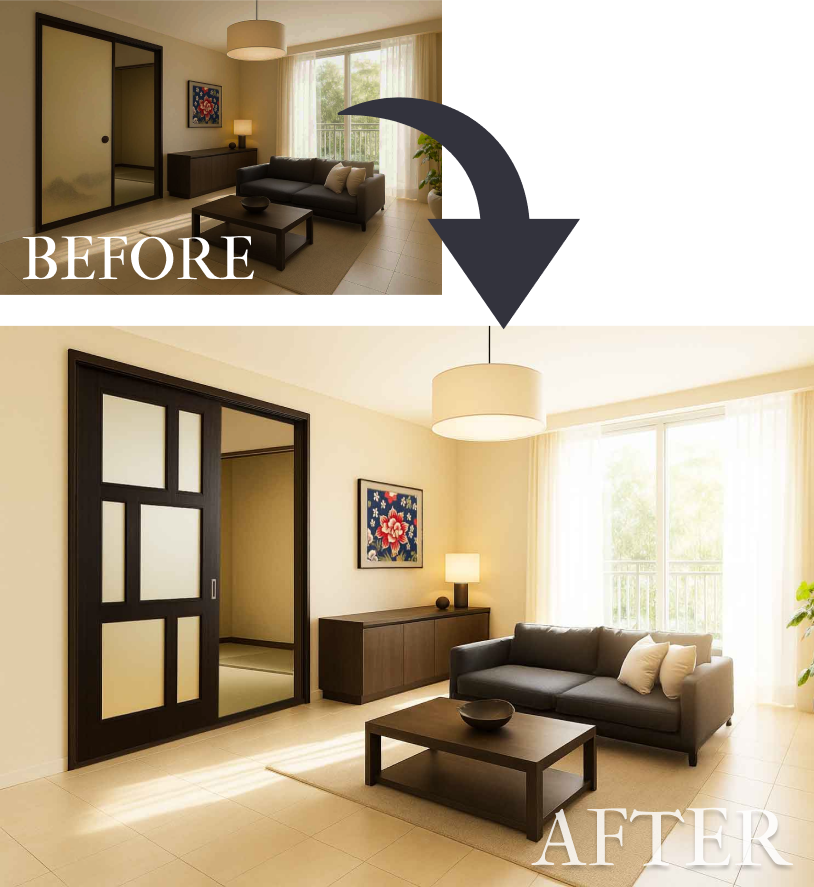 和室の建具をアルミ引き戸に交換したBefore→After。空間が明るく開放的に変化。